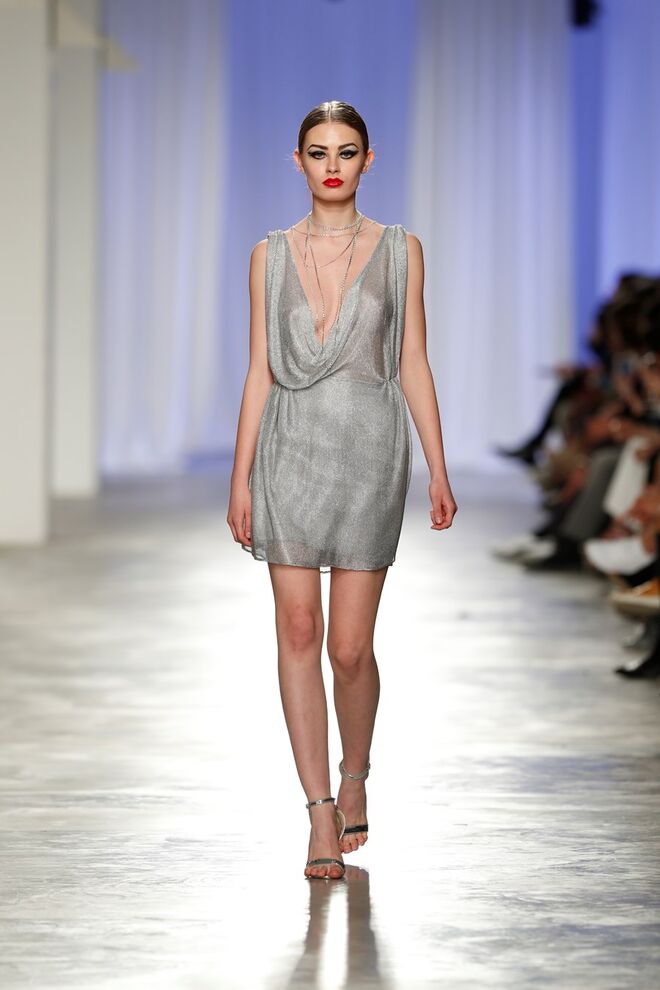 A coleção é complementada por sandálias prateadas e acessórios de formato minimalista.
