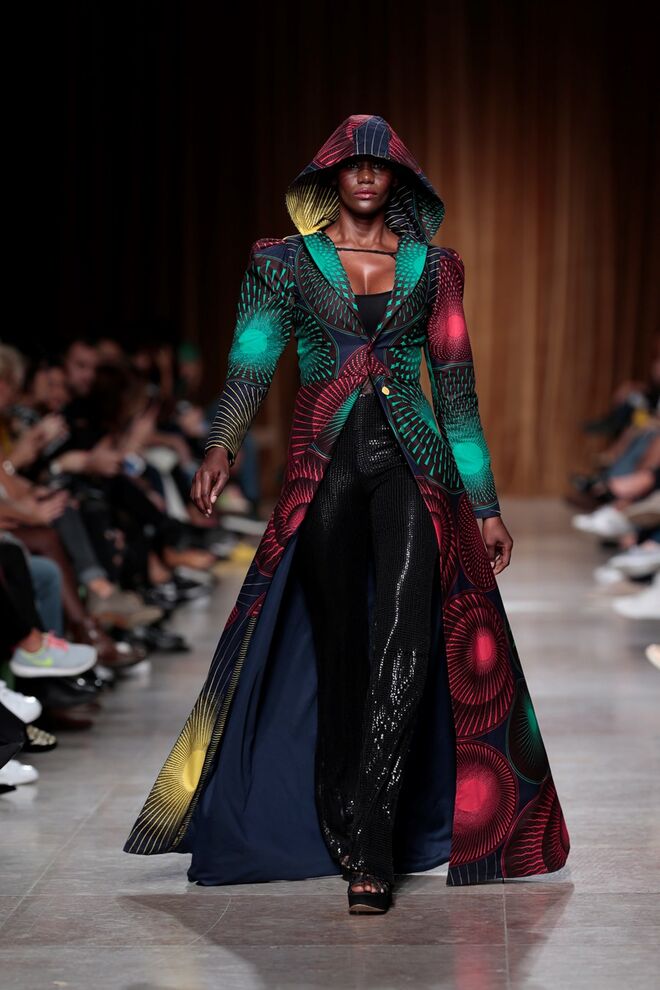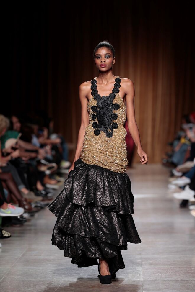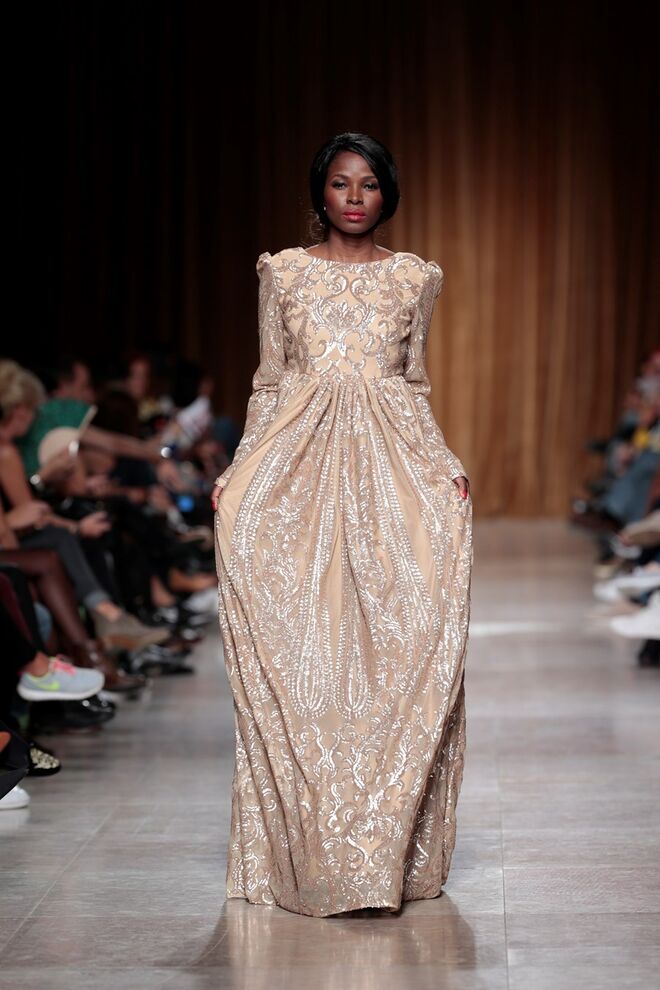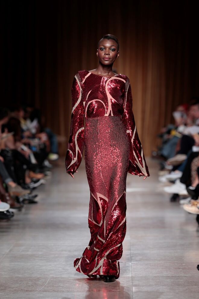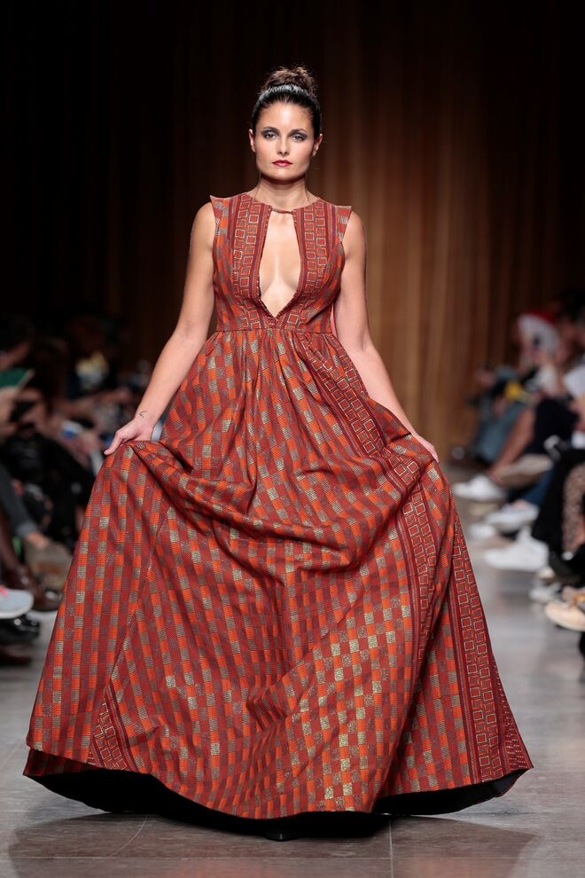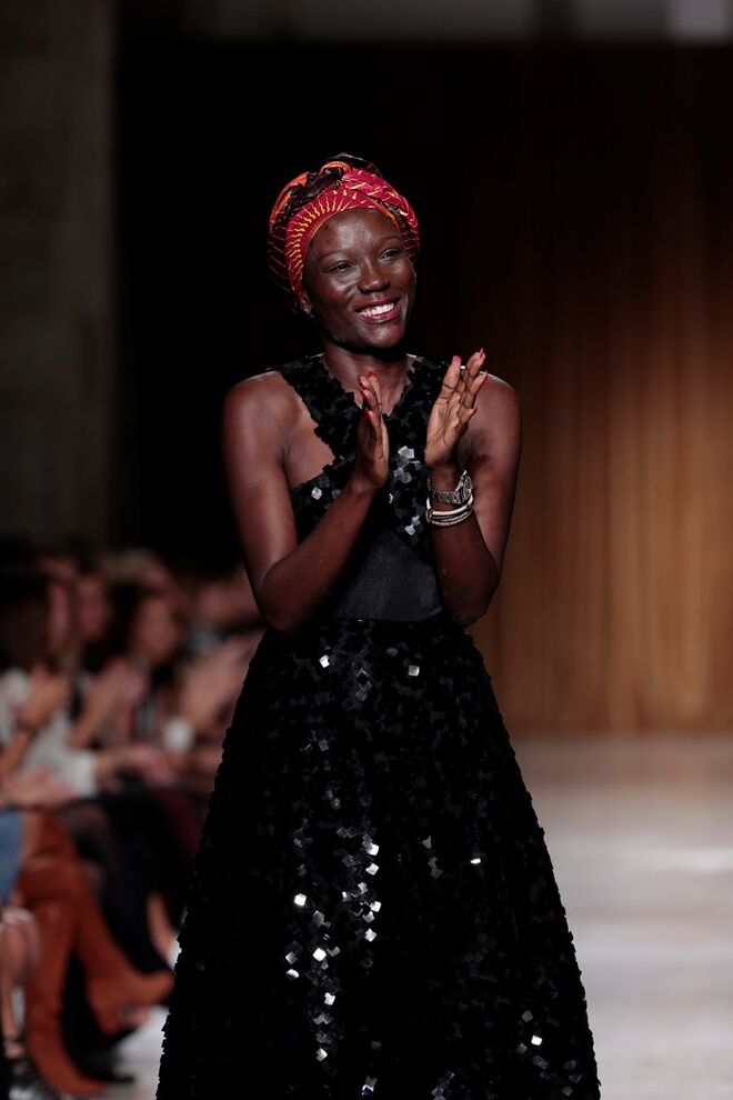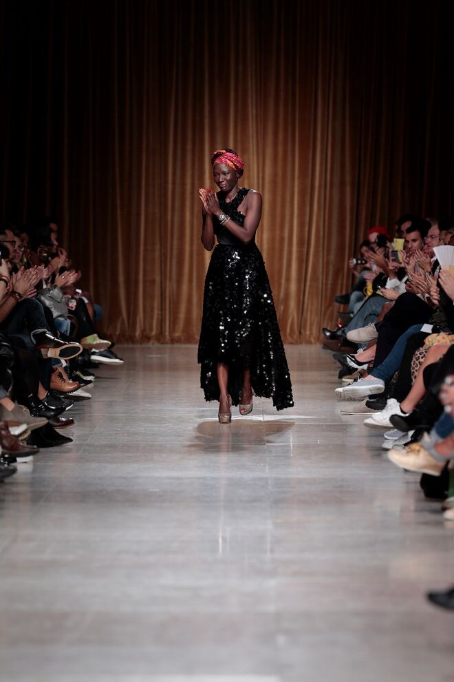 "Almas de África" é o nome da coleção apresentada por Nadir Tati, um dos maiores nomes da Alta Costura africana. A criadora apostou em linhas simples e em fusões de tecidos e texturas para vestidos pretos, vermelhos e dourados com bordados e pedras adicionadas à mão. Rendas, organzas, sedas e o tradicional super wax africano completam a coleção.