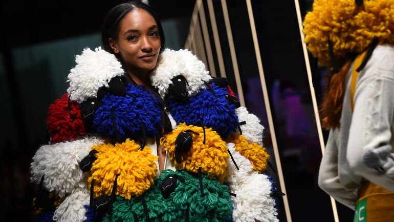 A coleção The Rainbow Machine para o outono/inverno 2019 foi apresentada no primeiro dia da semana de moda italiana, em Milão (na verdade, a Benetton sempre apresentou as suas coleções um dia antes deste certame, mas nunca foi considerada parte integrante do mesmo, até agora). Este, que foi o primeiro desfile oficial da marca, homenageou a produção industrial com a instalação de máquinas a meio da passerelle; a cor e a criatividade. As cores primárias do arco-íris - amarelo, vermelho, verde, azul, com alguns toques de preto – surgiram em peças volumosas, com estampados de personagens do mundo da animação como o Looney Tunes, ou ovelhas. Castelbajac resgatou as cores vibrantes da Benetton, os padrões esbatidos e também deu destaque ao logo da marca, em estampados oversized em peças como camisolas ou calças. Outra das preocupações de Castelbajac foi a luta contra o desperdício, aproveitando restos de tecidos para juntar a camisolas, uma ideia que lhe surgiu durante a produção nas fábricas.