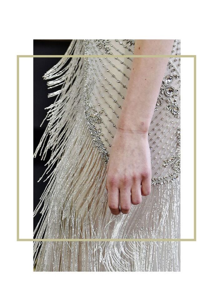 Mas houve um vestido que se destacou pela sua exuberância. Trata-se de um vestido longo repleto de franjas, em tule e musselina de seda, cravejado com pedrinhas de cristal. Em entrevista ao site da revista Elle britânica, Monique Lhuillier revelou que vê "este vestido numa mulher confidente, apreciadora de roupas maravilhosamente desenhadas e trabalhadas".