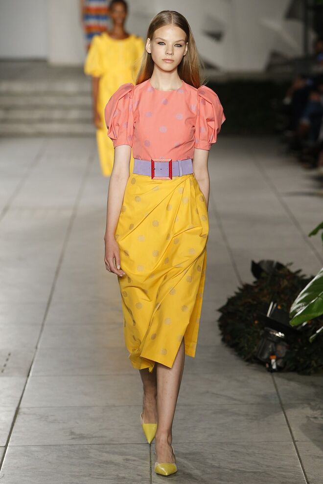 Jogos de volumes e peças ultrafemininas em seda, tule e cetim de cores vibrantes, como o amarelo e o cor-de-rosa, marcam a coleção de verão de Roksanda.