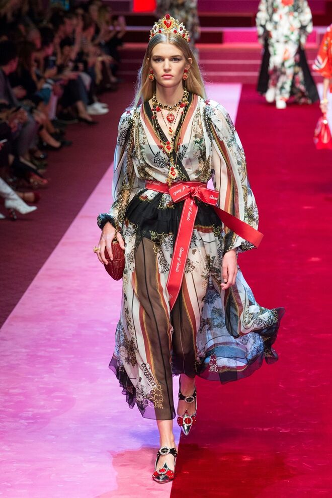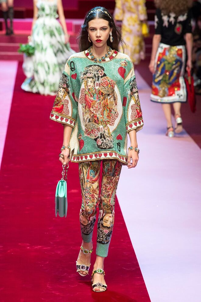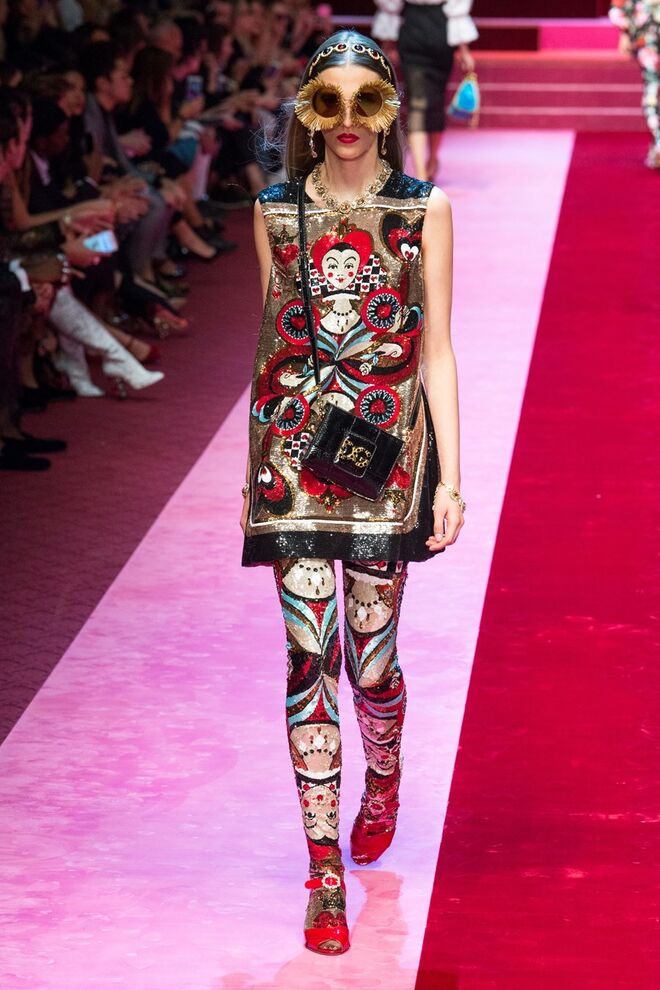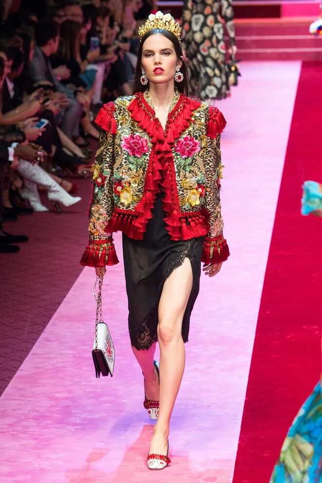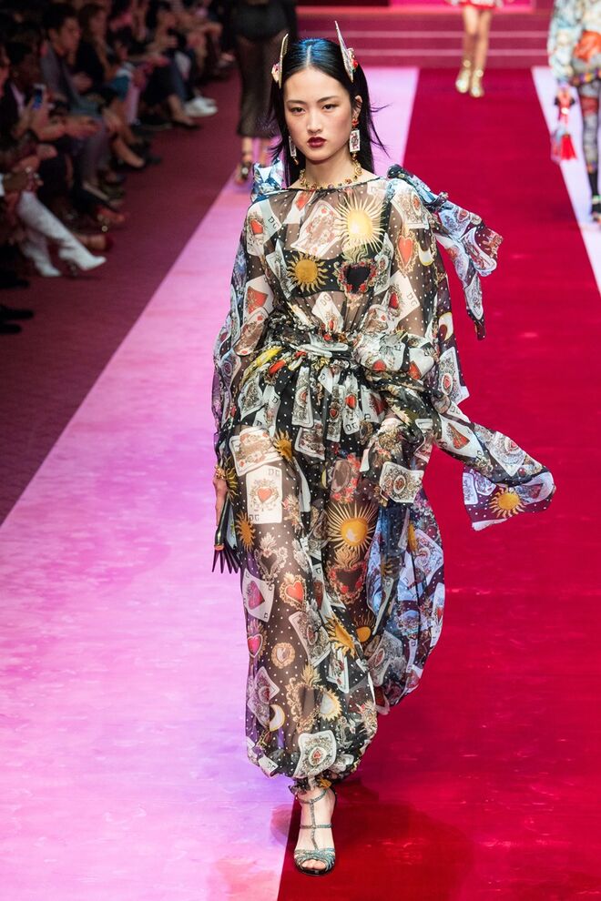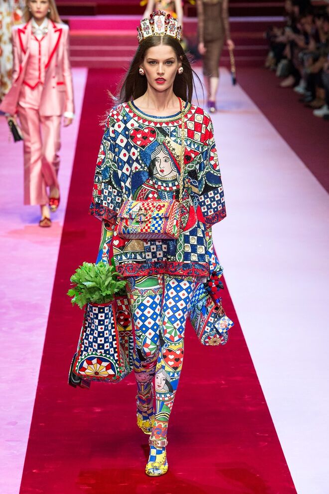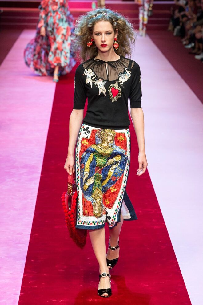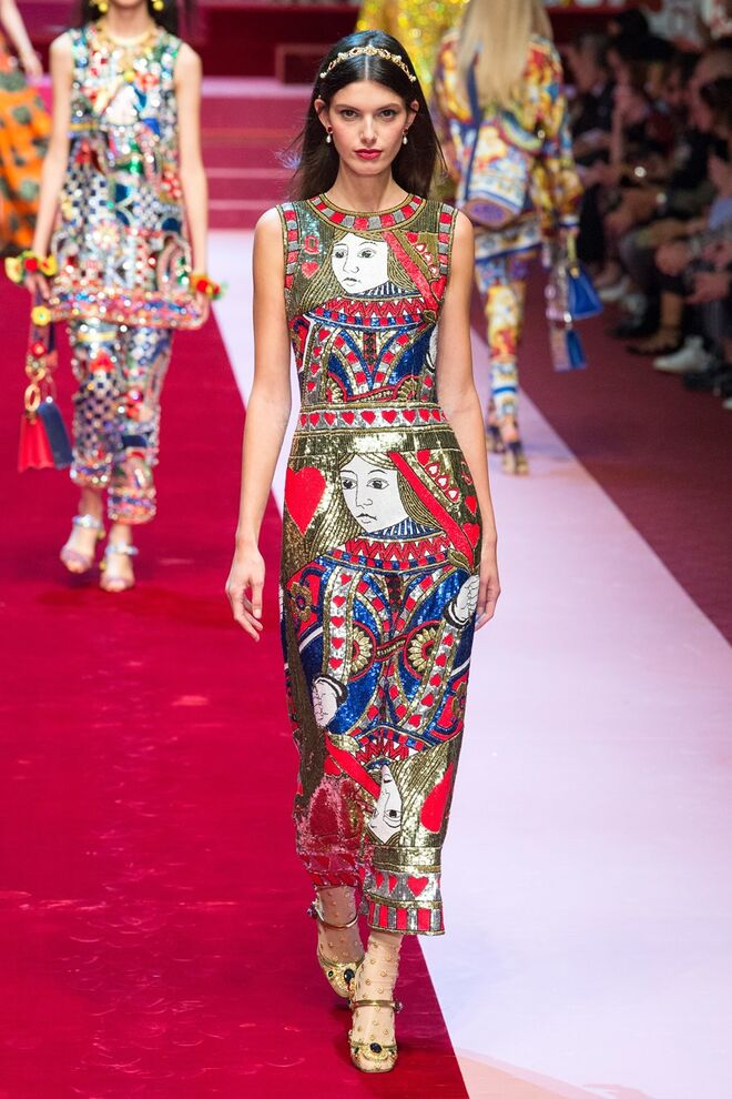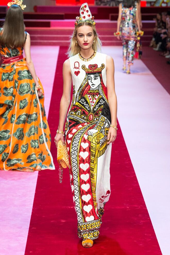 A Rainha de Copas foi a inspiração da última coleção da Dolce & Gabbana, entre penas, brilhos e muitas franjas. As transparências e a lingerie serviram de contraste a vestidos estampados e volumosos numa coleção carregada de glamour.