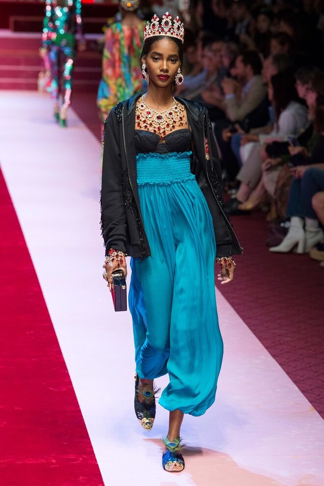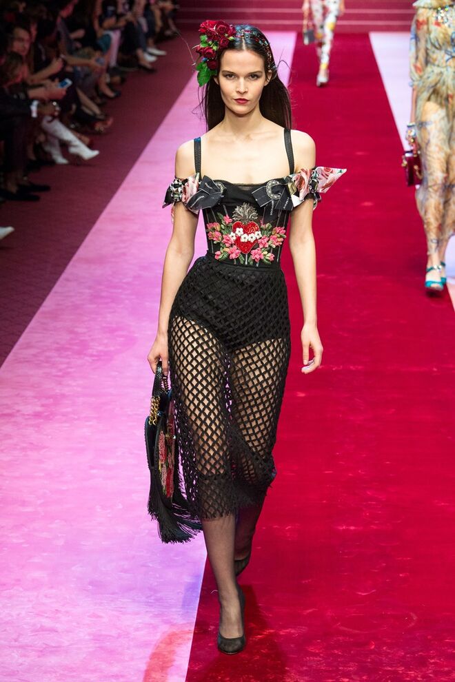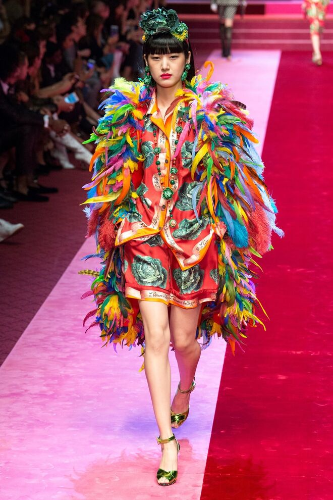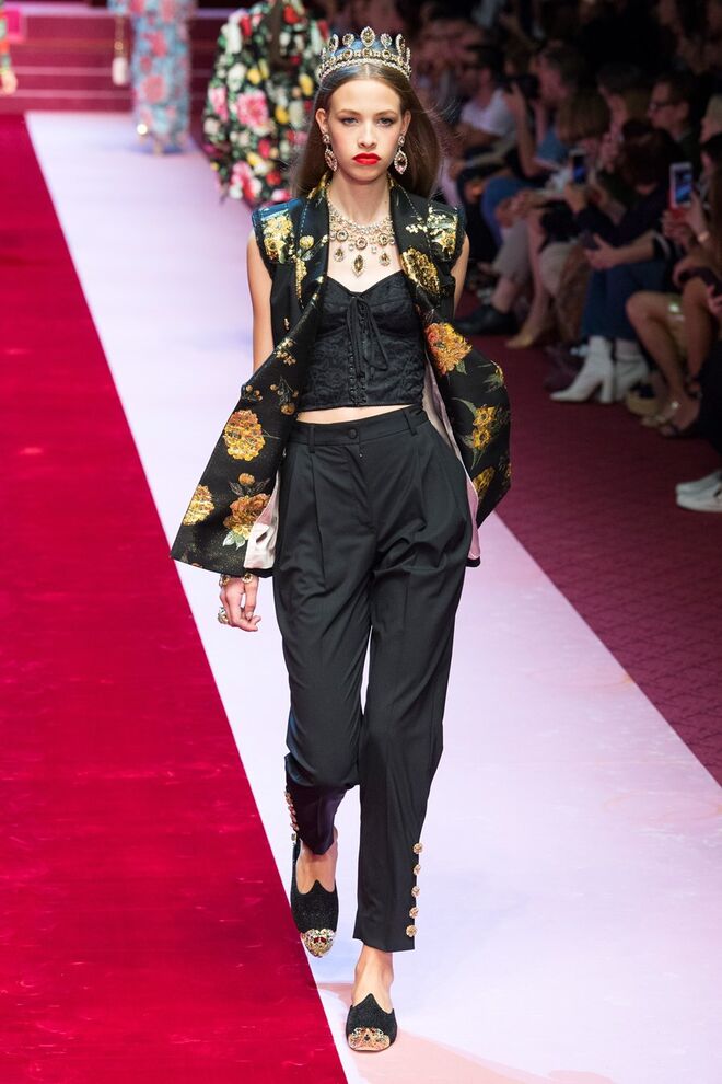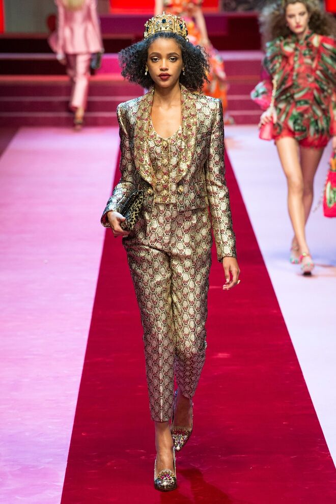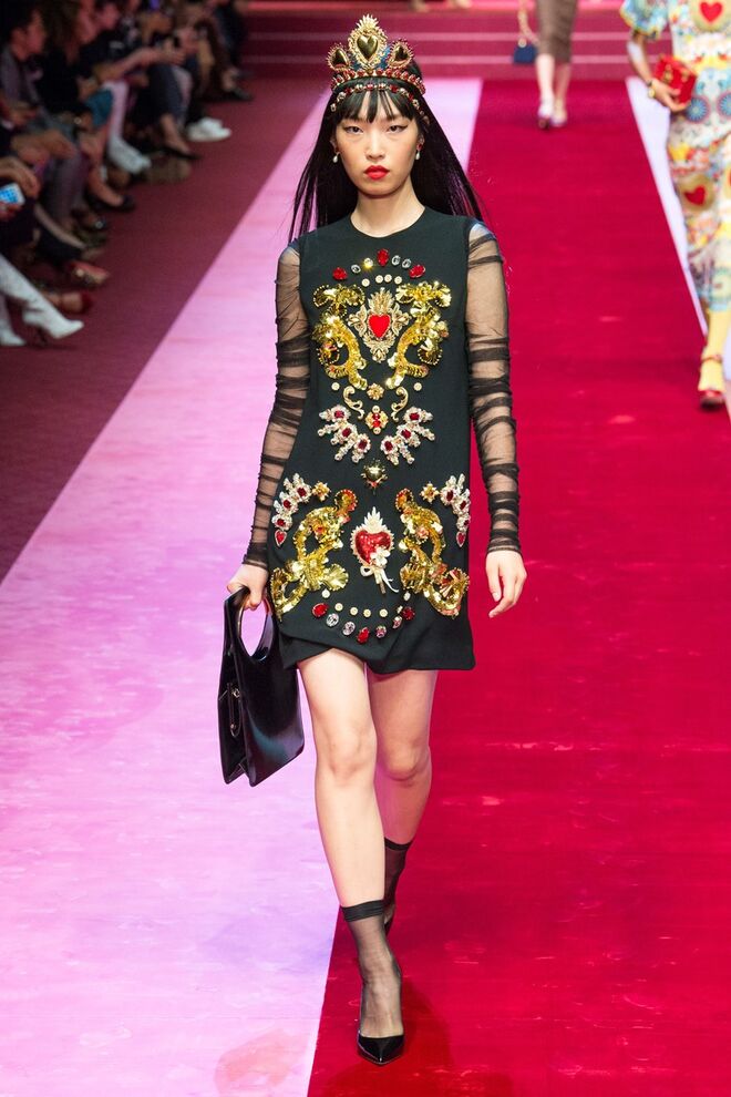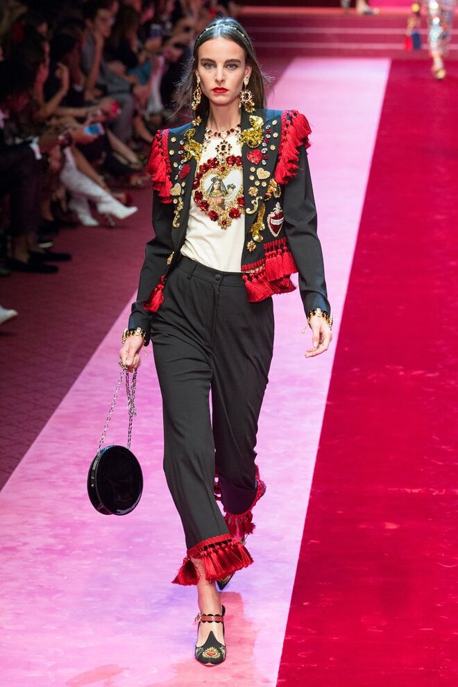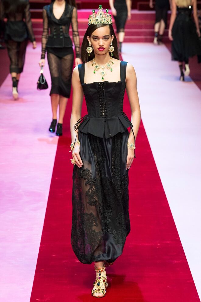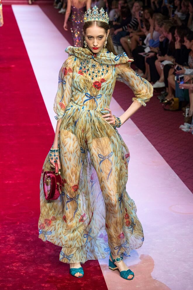 A Rainha de Copas foi a inspiração da última coleção da Dolce & Gabbana, entre penas, brilhos e muitas franjas. As transparências e a lingerie serviram de contraste a vestidos estampados e volumosos numa coleção carregada de glamour.