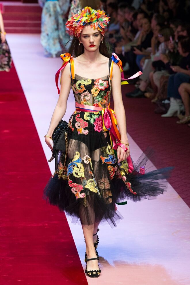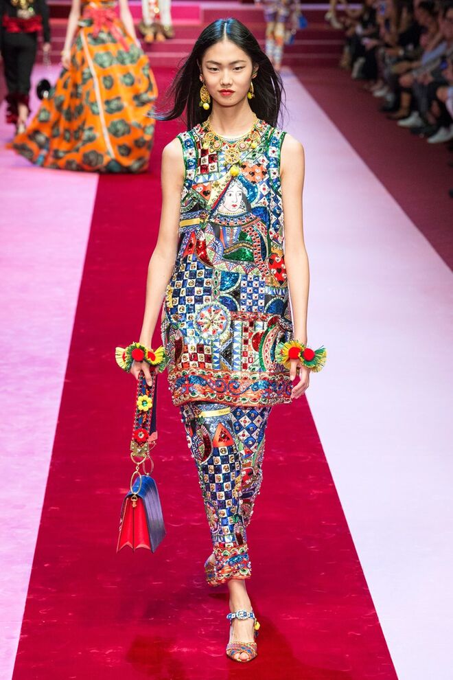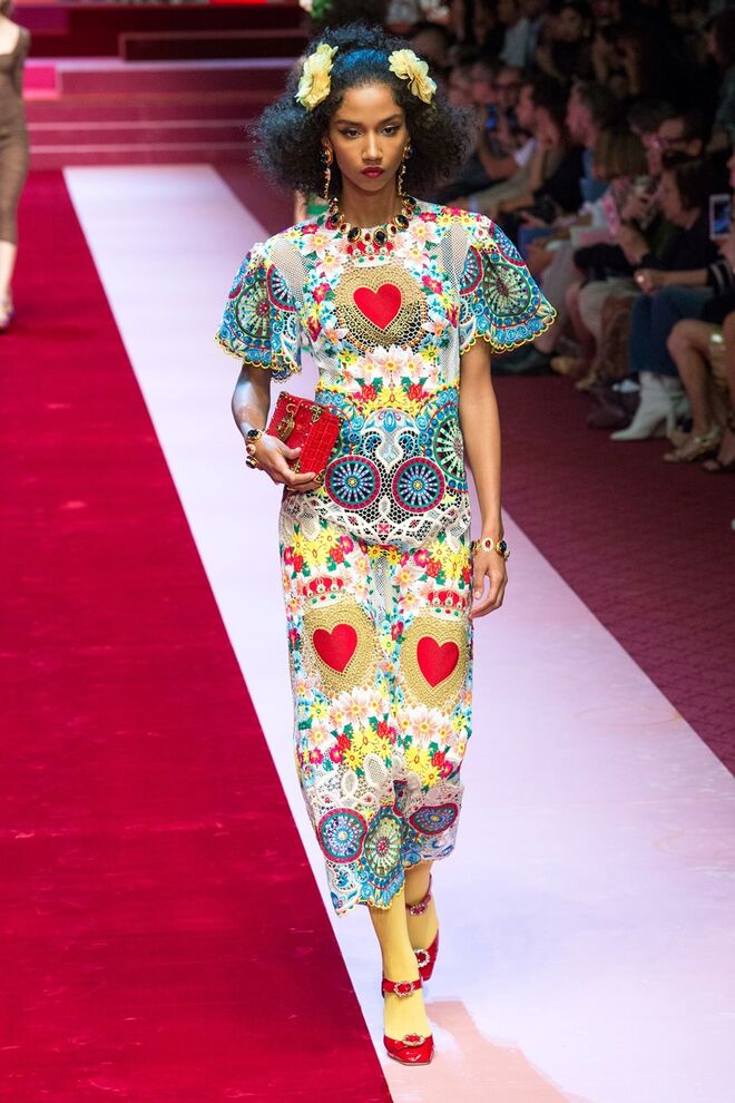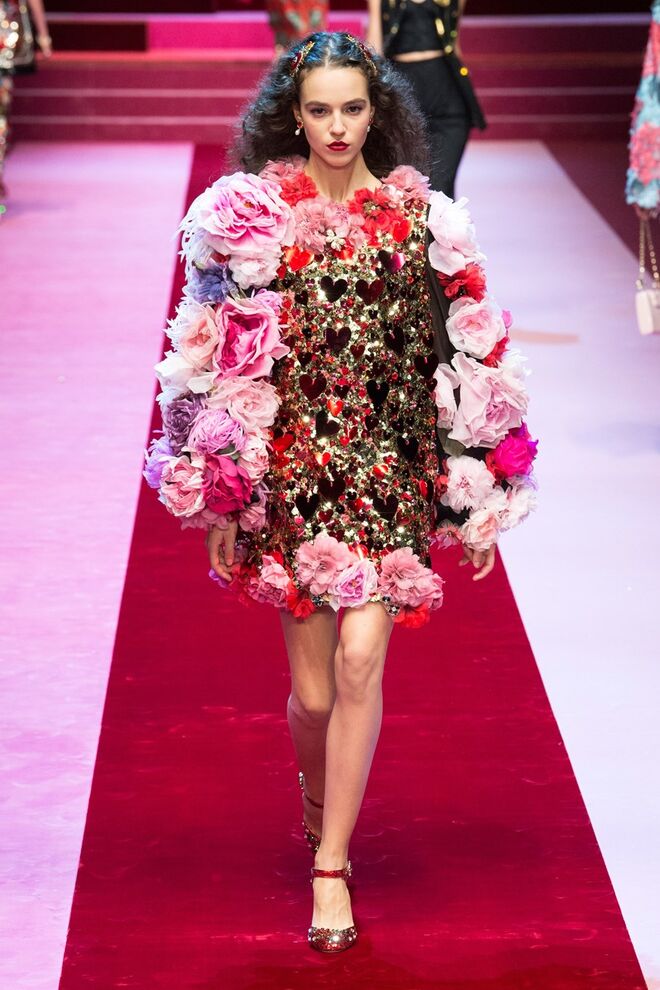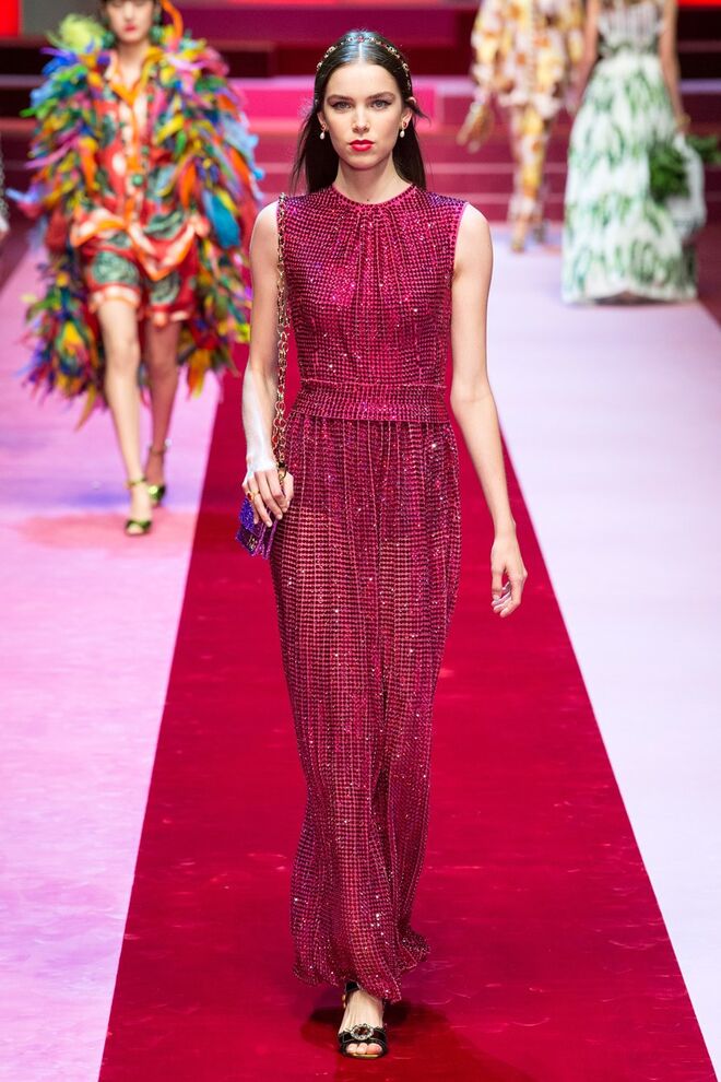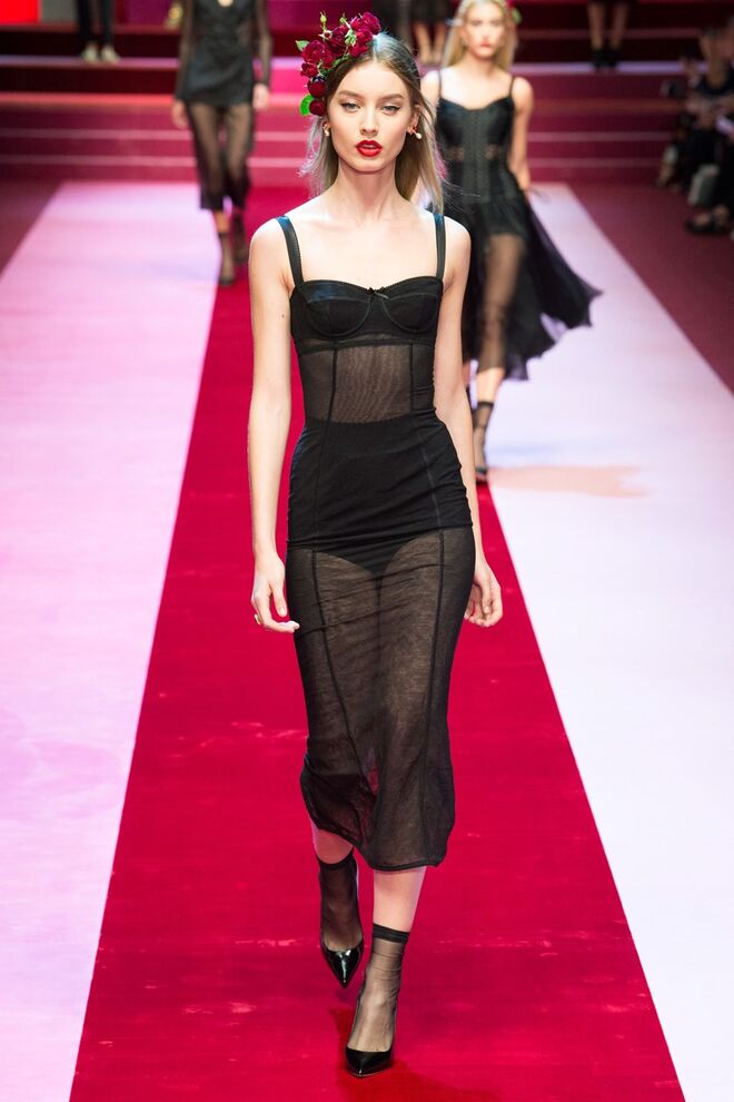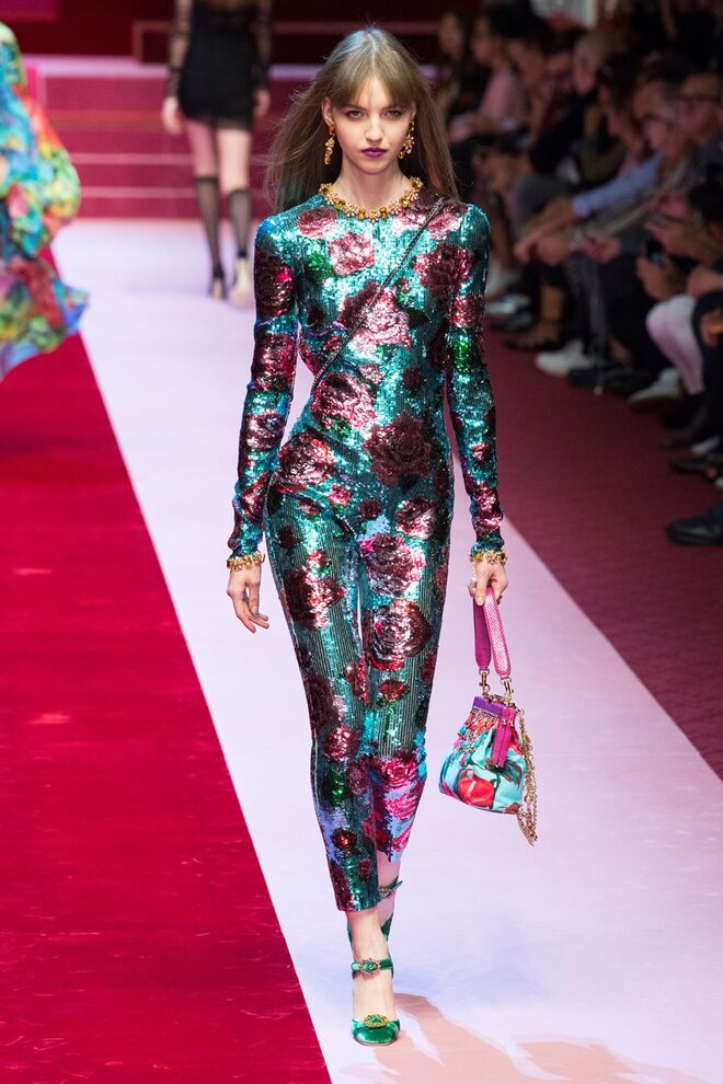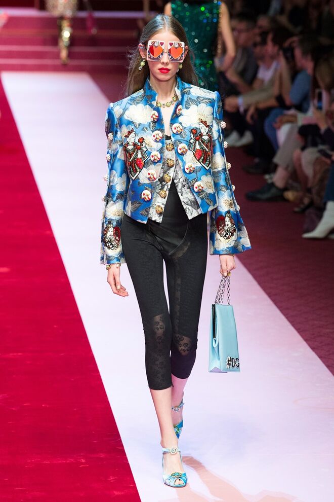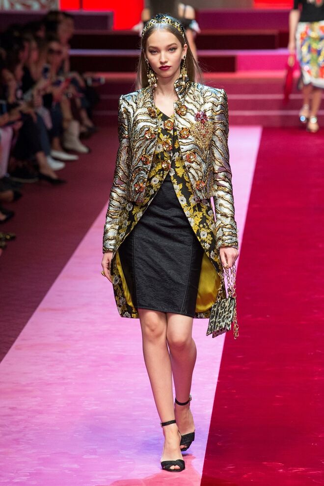 A Rainha de Copas foi a inspiração da última coleção da Dolce & Gabbana, entre penas, brilhos e muitas franjas. As transparências e a lingerie serviram de contraste a vestidos estampados e volumosos numa coleção carregada de glamour.