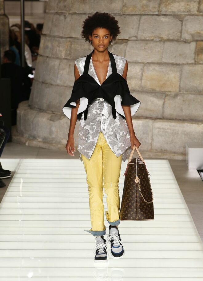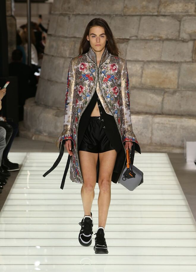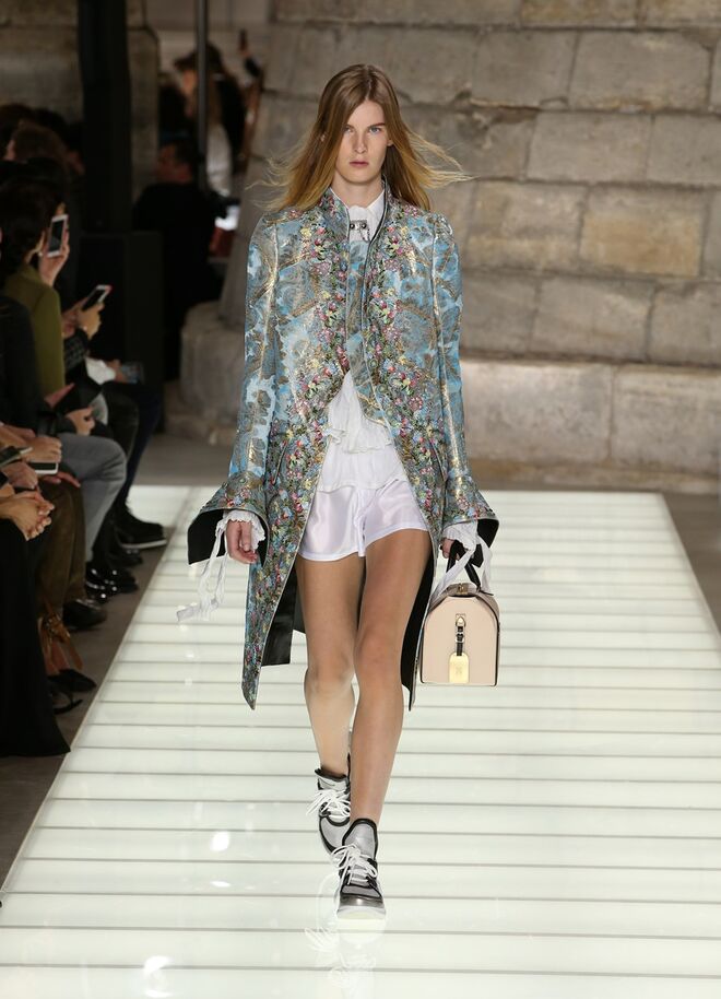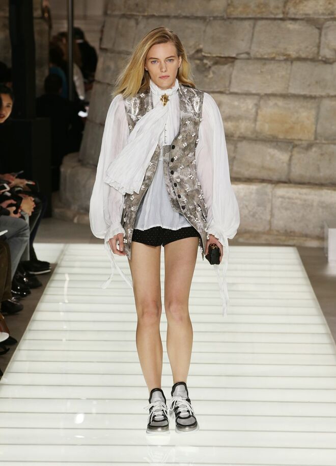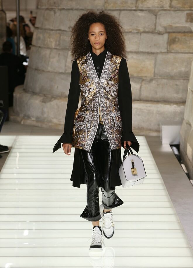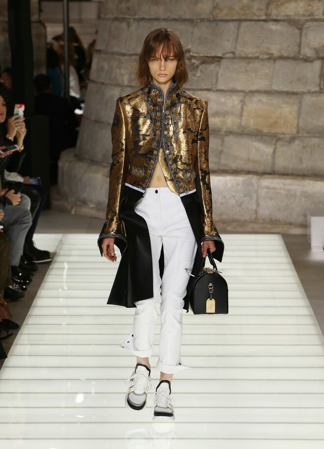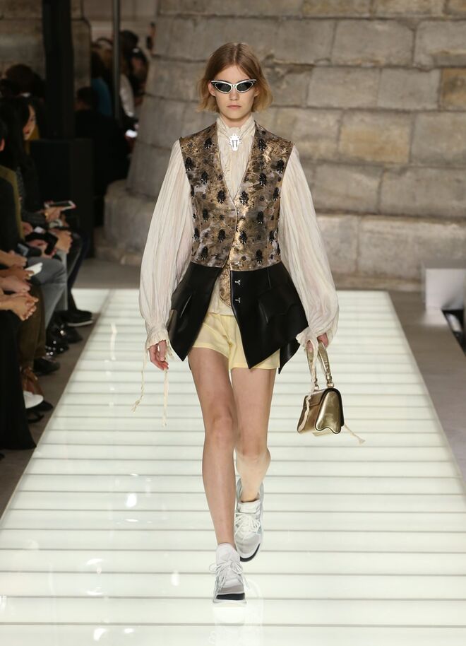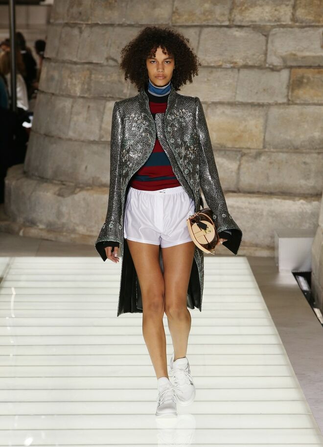 Nicolas Ghesquière trouxe à passerelle referências históricas do século XVIII, mas reinterpretou-as, cruzando-as com influências do sportswear. O resultado? Casacos estruturados com brocados metalizados conjugados com calções desportivos em seda e ténis. A coleção da Louis Vuitton recria a harmonia perfeita entre dois conceitos opostos.