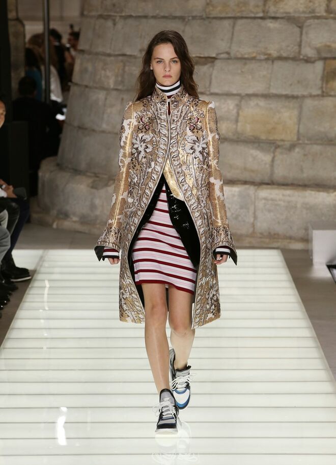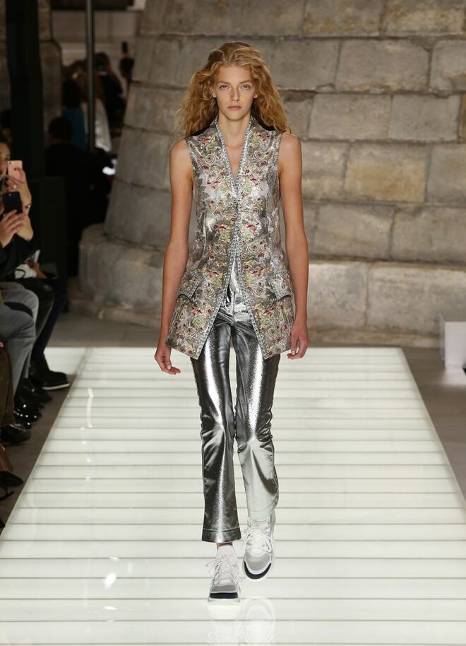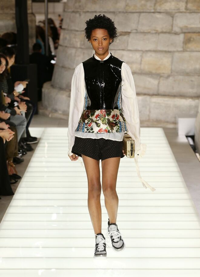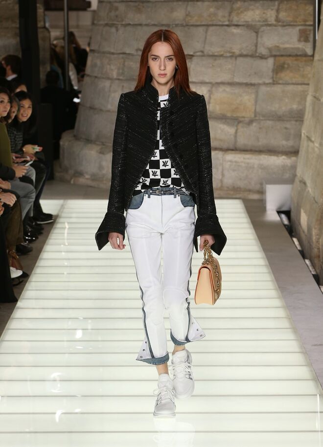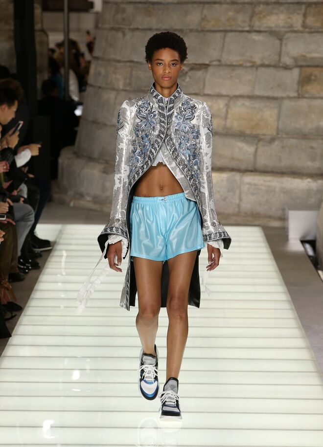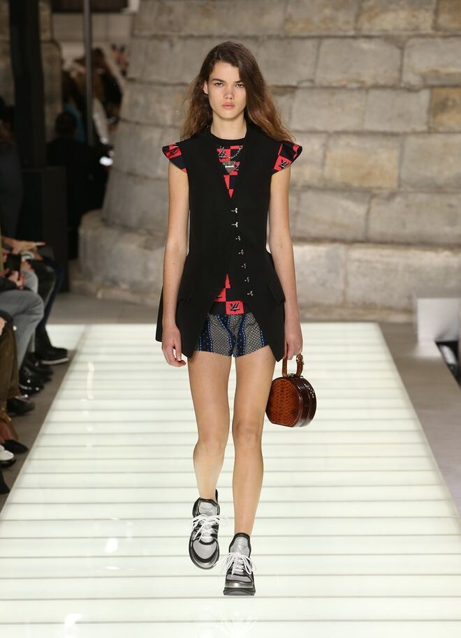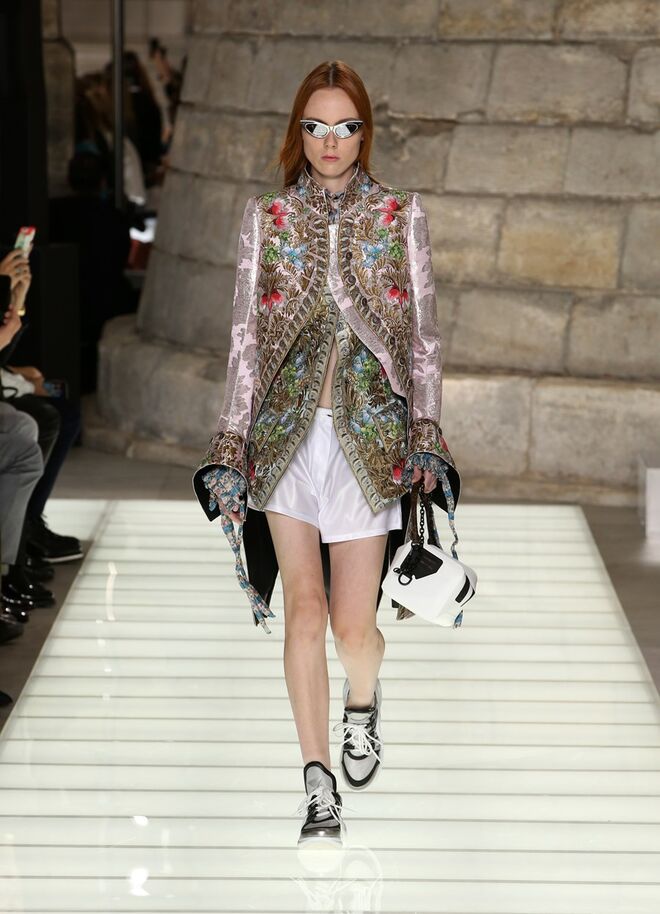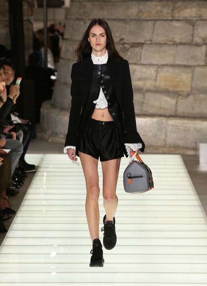 Nicolas Ghesquière trouxe à passerelle referências históricas do século XVIII, mas reinterpretou-as, cruzando-as com influências do sportswear. O resultado? Casacos estruturados com brocados metalizados conjugados com calções desportivos em seda e ténis. A coleção da Louis Vuitton recria a harmonia perfeita entre dois conceitos opostos.