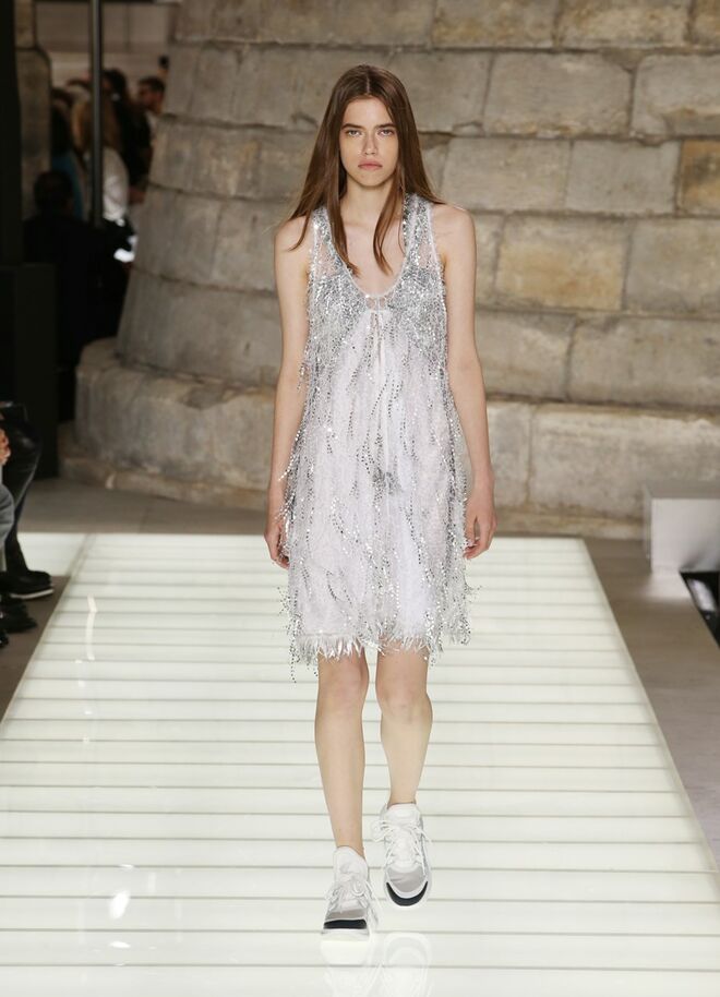 Vestidos com padrões africanos, blusões em ganga oversized e saias de baile combinadas com t-shirts largas fazem parte do universo de Stella McCartney para a primavera/verão de 2018. As linhas simplificadas já caraterísticas da estética da marca são agora pintadas em vermelho e magenta, cores que se destacam entre os tradicionais tons terra e o azul escuro neutro de alguns looks mais sóbrios da coleção.