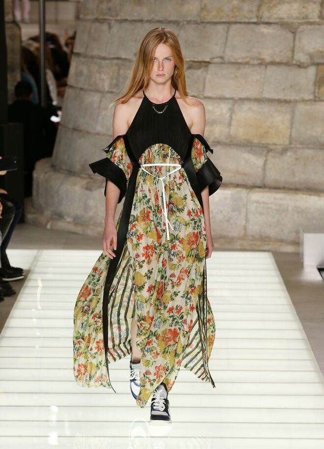 Os opostos atraem-se na nova coleção de Giambattista Valli. Vestidos fluídos, padrões florais e os bralettes inspirados na lingerie do início do século XX são agora conjugados com camisas às riscas e coletes de malha saídos dos anos 70.