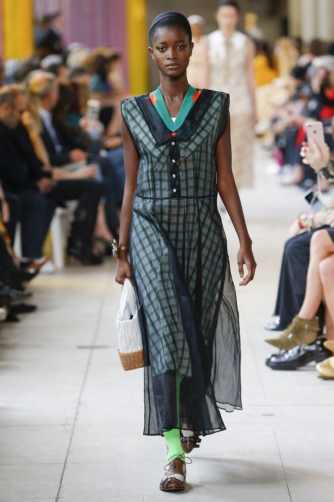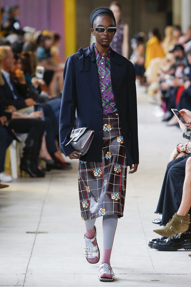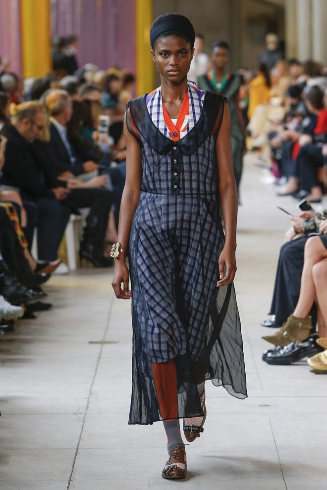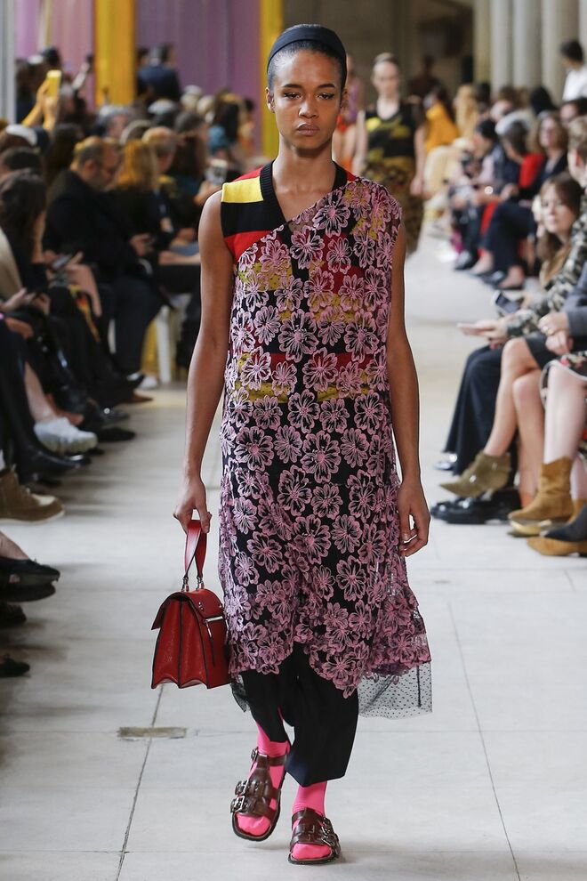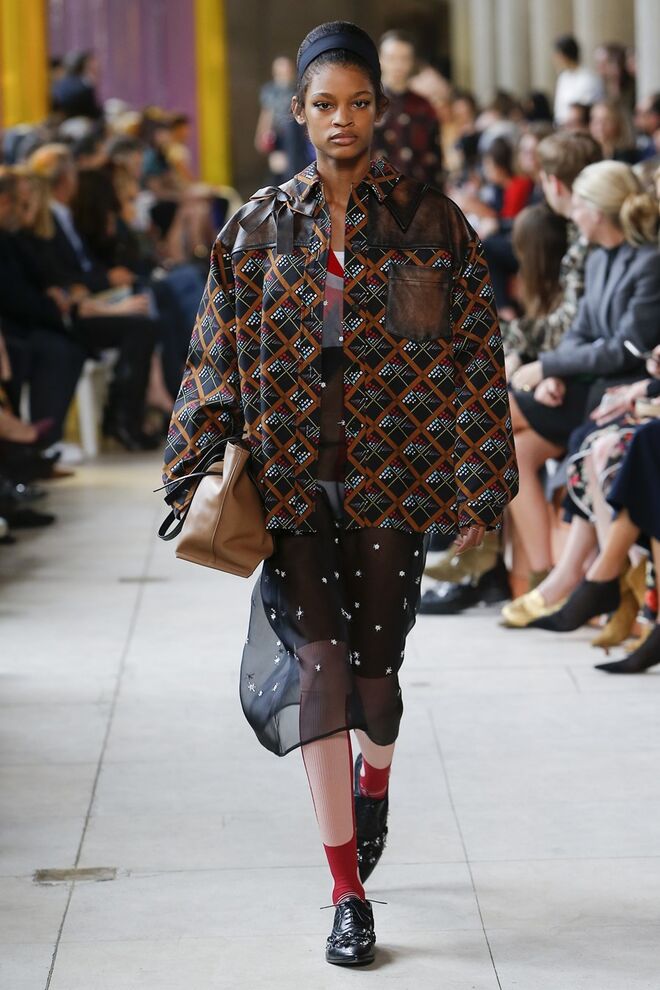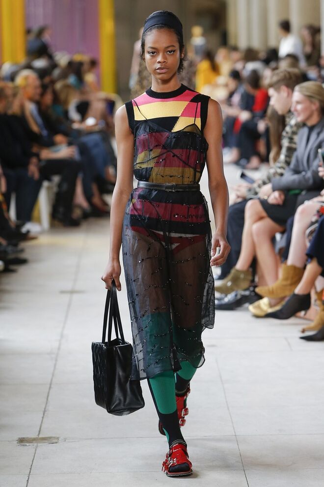 Vestidos com padrões africanos, blusões em ganga oversized e saias de baile combinadas com t-shirts largas fazem parte do universo de Stella McCartney para a primavera/verão de 2018. As linhas simplificadas já caraterísticas da estética da marca são agora pintadas em vermelho e magenta, cores que se destacam entre os tradicionais tons terra e o azul escuro neutro de alguns looks mais sóbrios da coleção.