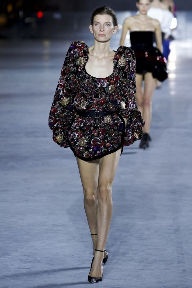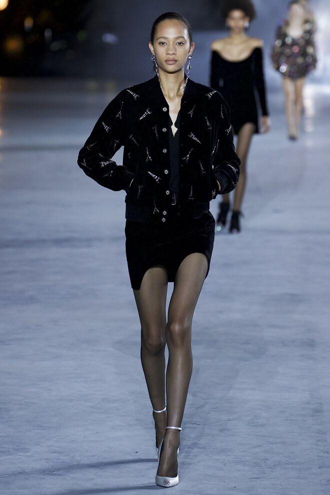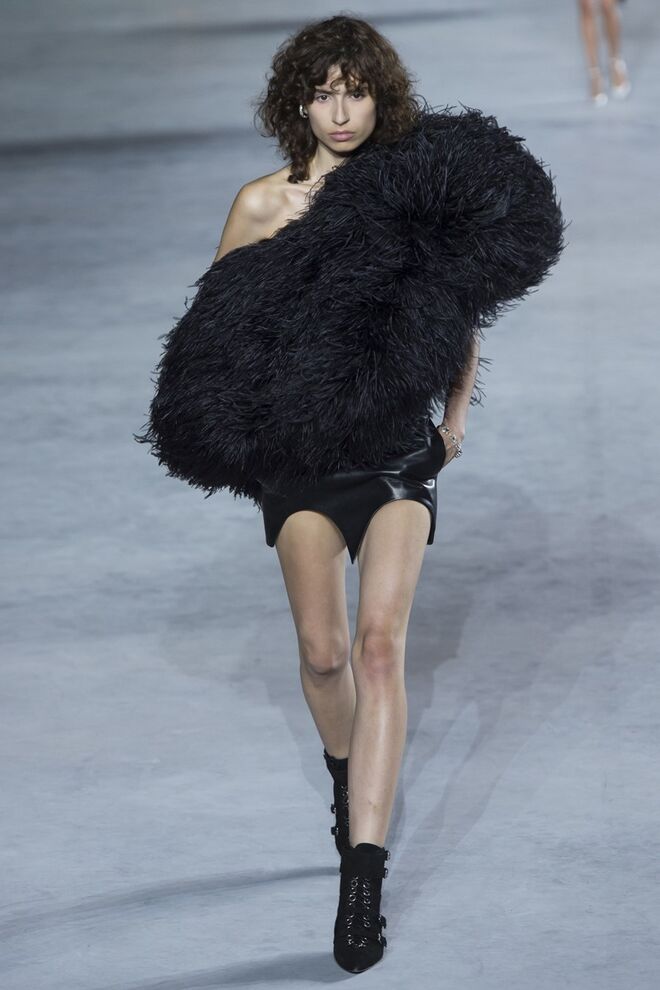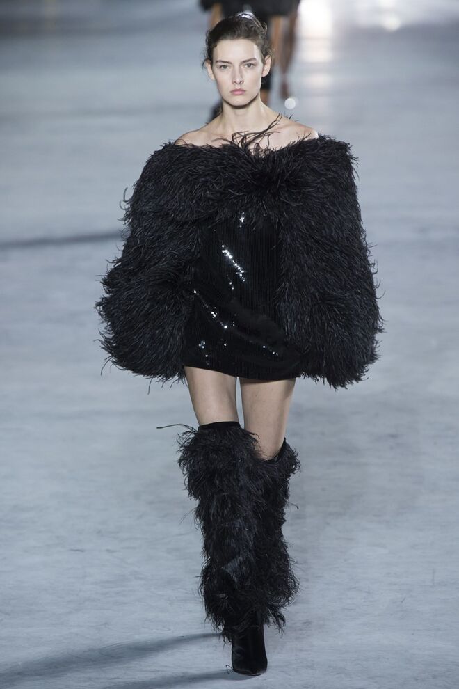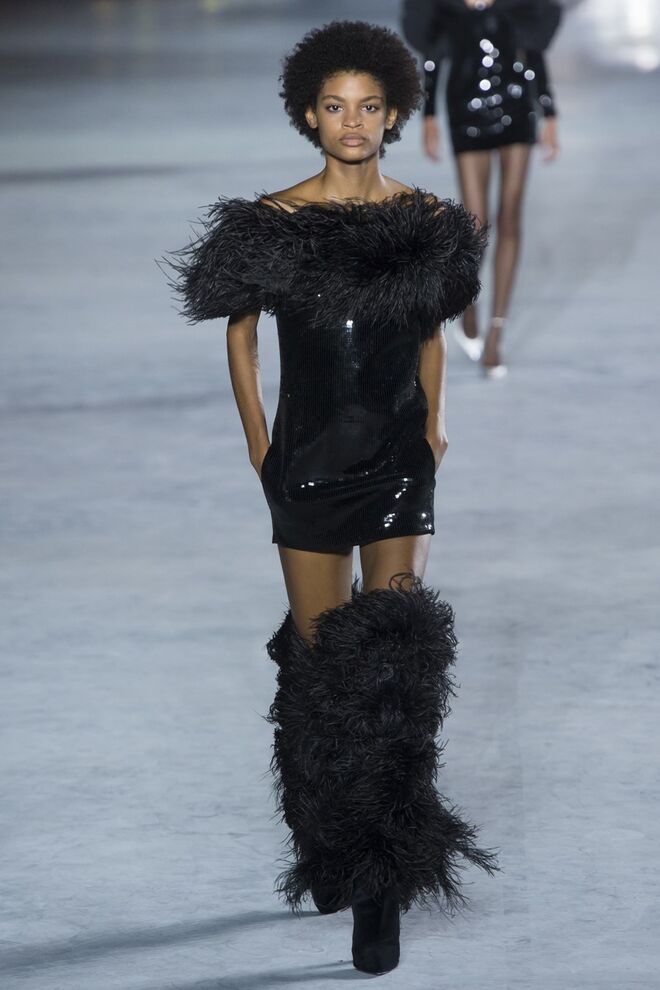 Esta estação Anthony Vaccarello devolve power e sex appeal Saint Laurent. Casacos em pele, preto e encarnado, microvestidos coleantes e brilhantes, adornados joias, penas e todo um imaginário que nos fala sobre noite, festas, rock'n'roll e glamour. Empoleirada nuns stilettos altíssimos, a mulher de Vaccarello pisa a passerelle e o mundo - é a mulher que queremos ser.