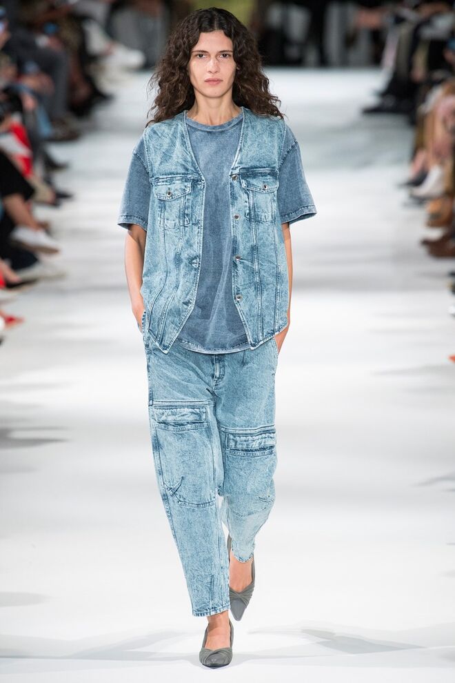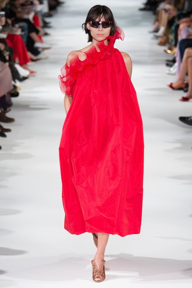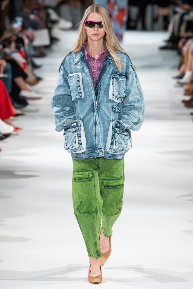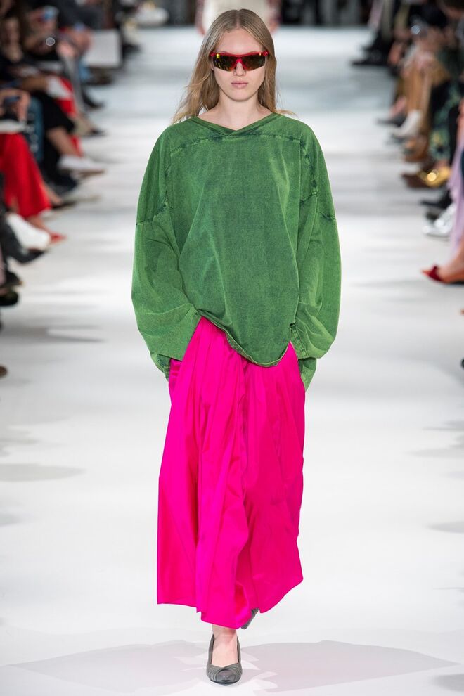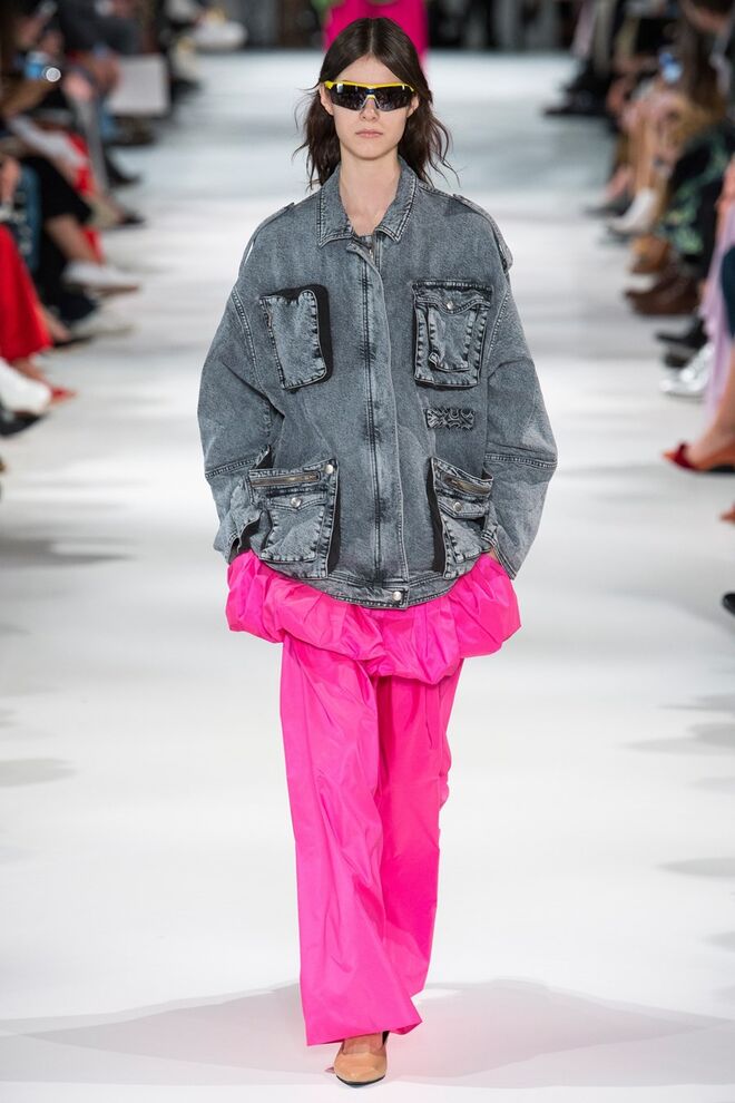 Vestidos com padrões africanos, blusões em ganga oversized e saias de baile combinadas com t-shirts largas fazem parte do universo de Stella McCartney para a primavera/verão de 2018. As linhas simplificadas já caraterísticas da estética da marca são agora pintadas em vermelho e magenta, cores que se destacam entre os tradicionais tons terra e o azul escuro neutro de alguns looks mais sóbrios da coleção.