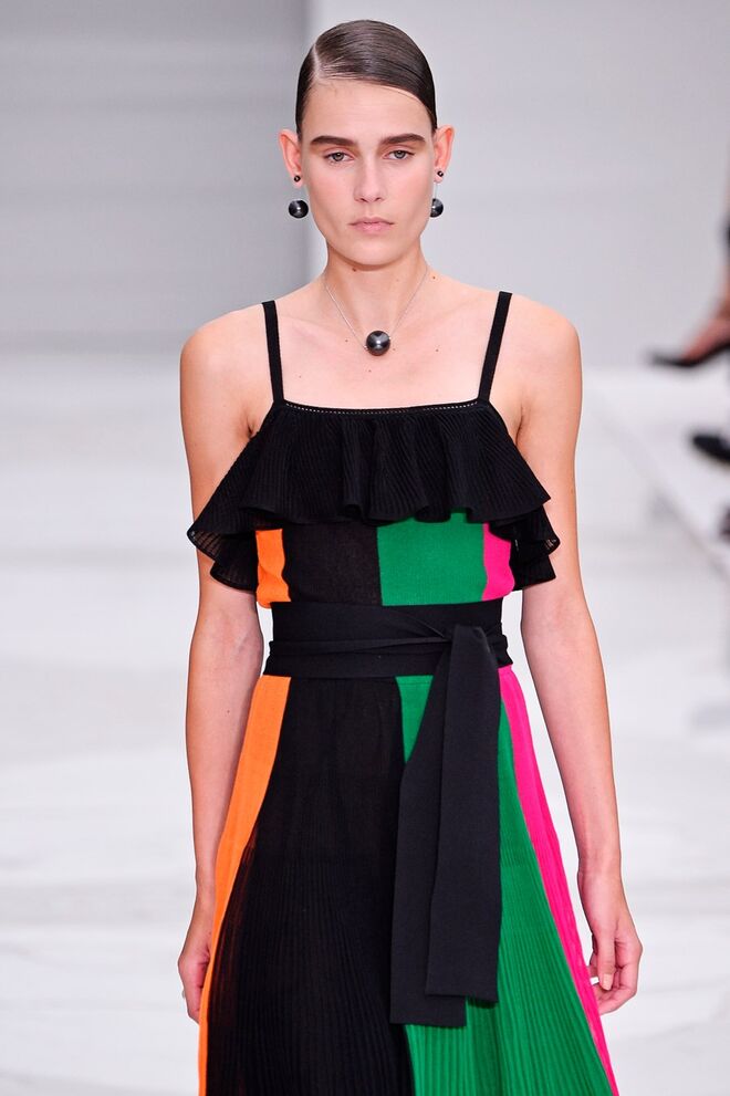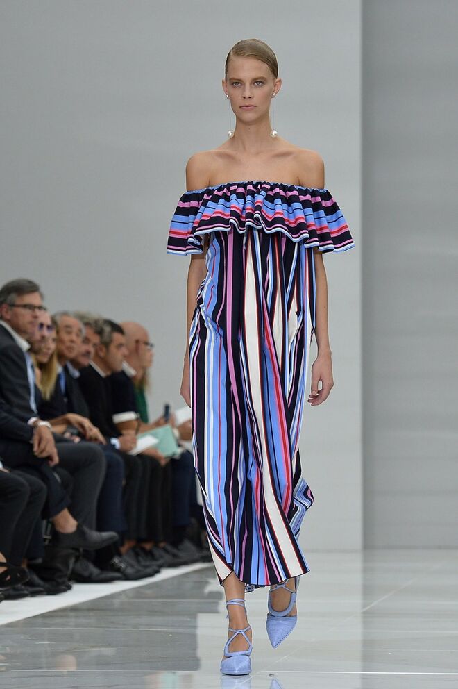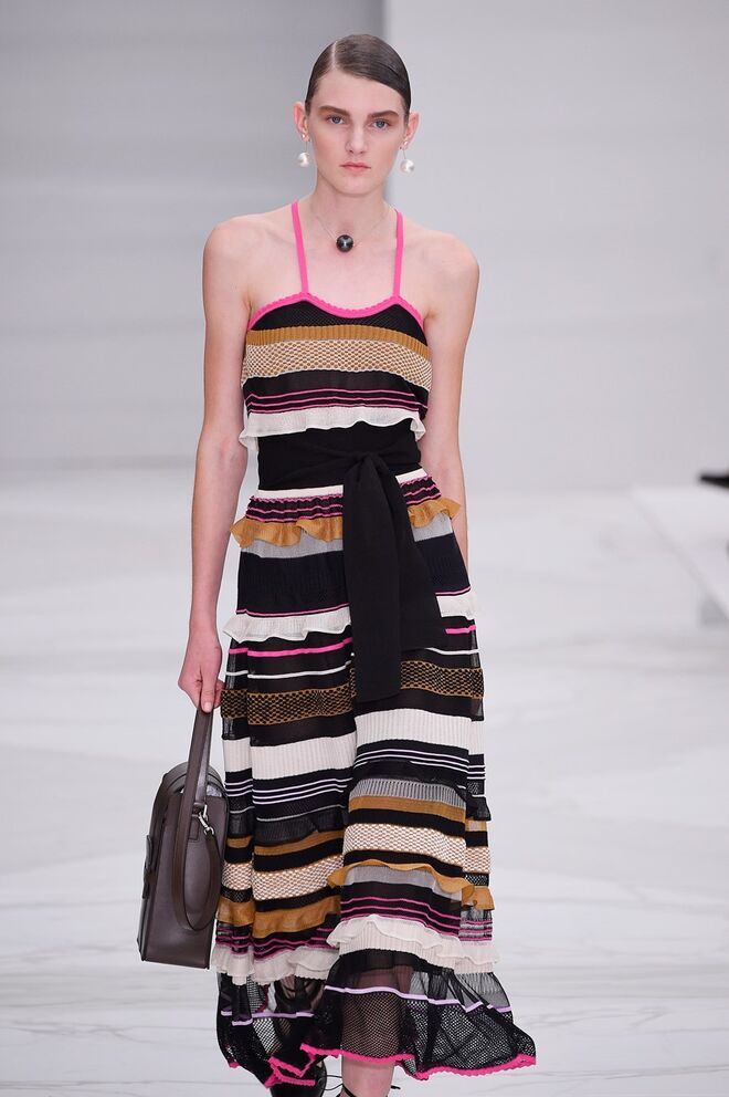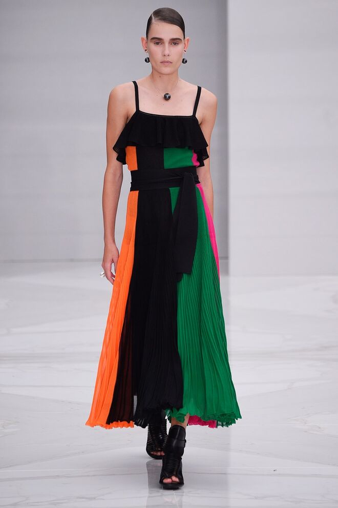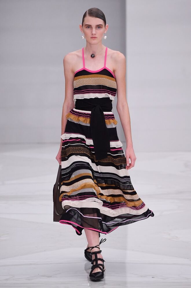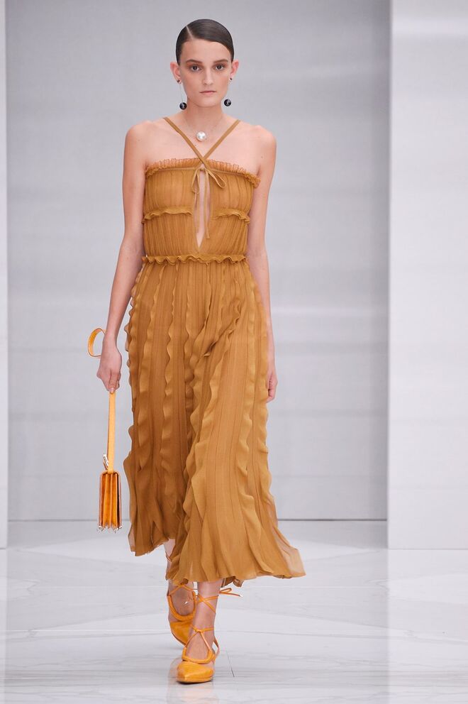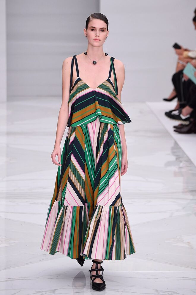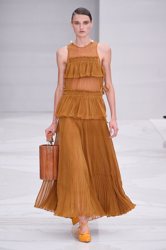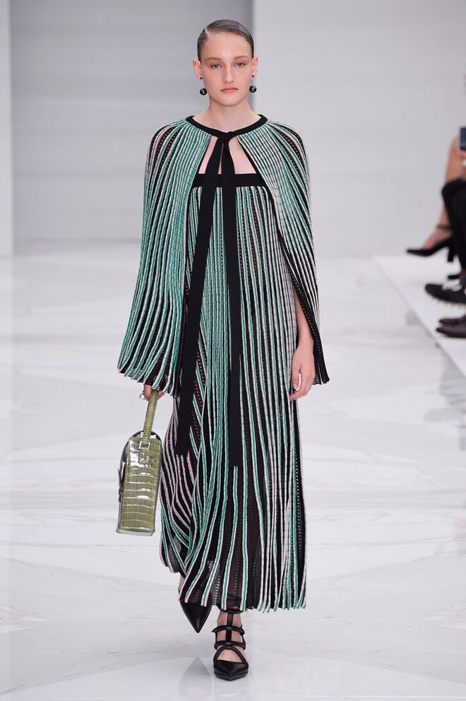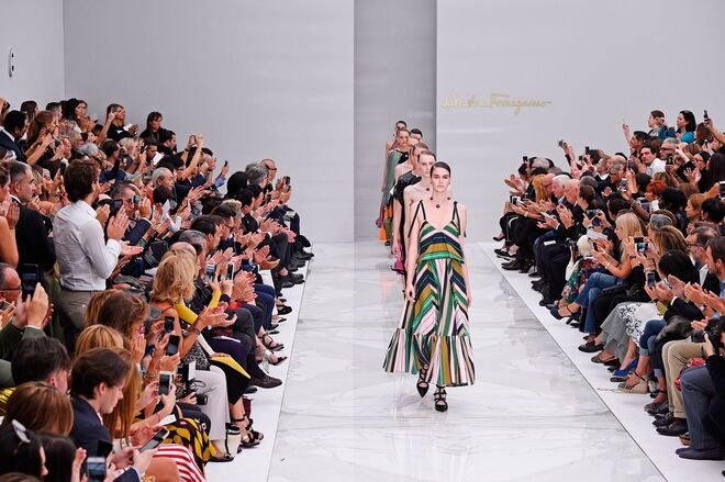 Feminina e romântica, a coleção de Ferragamo faz uso dos plissados e das riscas, introduzindo volume e atitude.