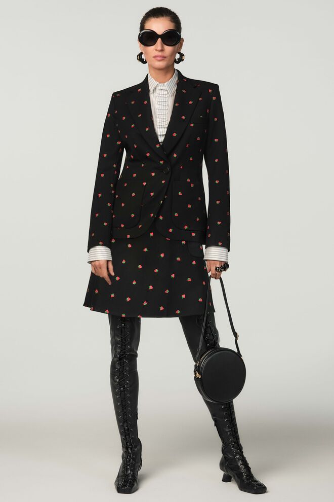 A coleção masculina aposta em peças mais ousadas, como um casaco de couro e blazers longos, ao lado de uma grande variedade de malhas tipo cardigan, algumas delas com cortes inesperados nas mangas. Uma t-shirt de malha e um casaco adornado com ilhós parecem fazer eco da estética de Random Identities, inspirada na vida noturna de Berlim. Para completar o conjunto, a coleção inclui acessórios marcantes como bolsas circulares, óculos de sol com proteção facial e joias com um toque nostálgico dos anos 80.