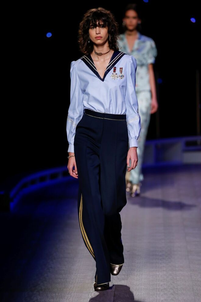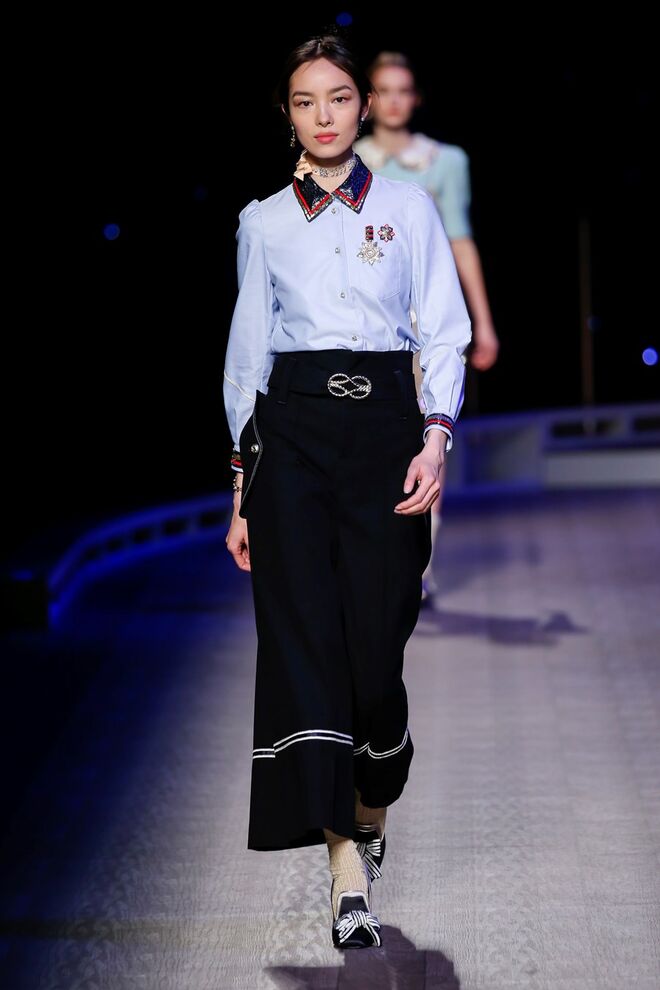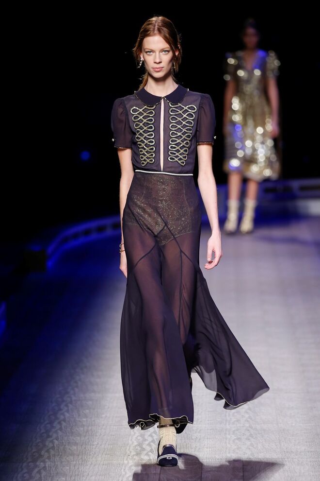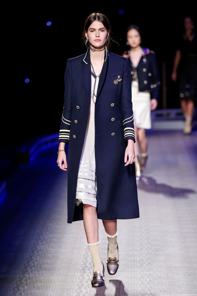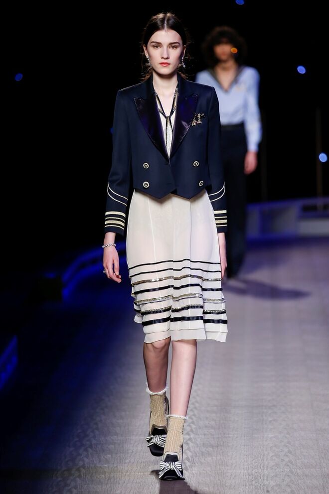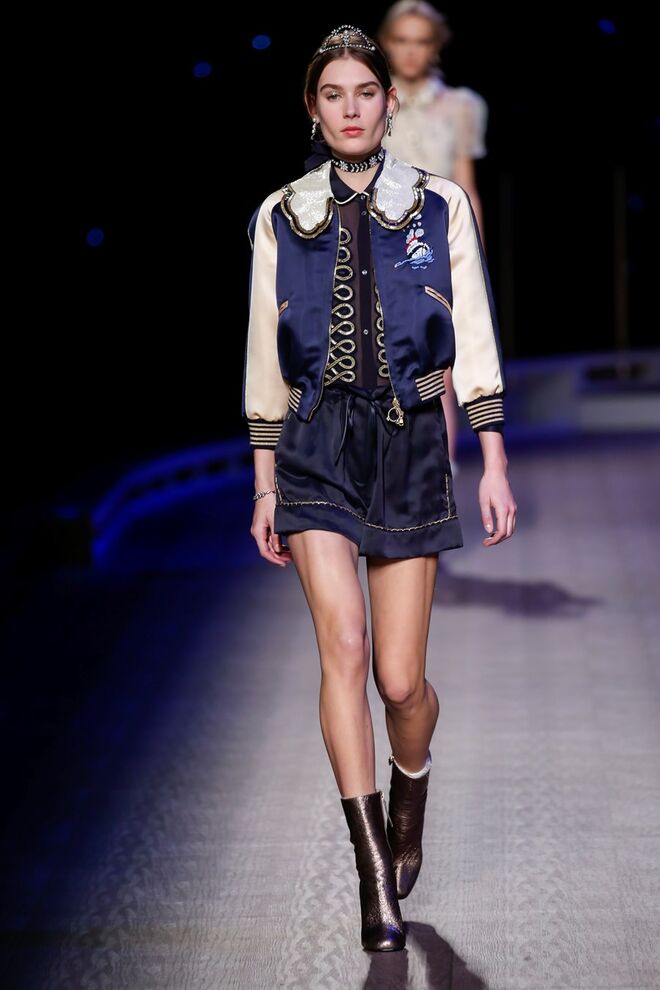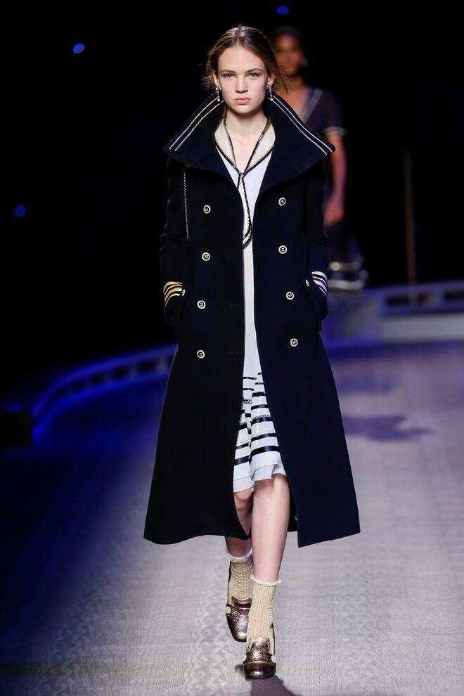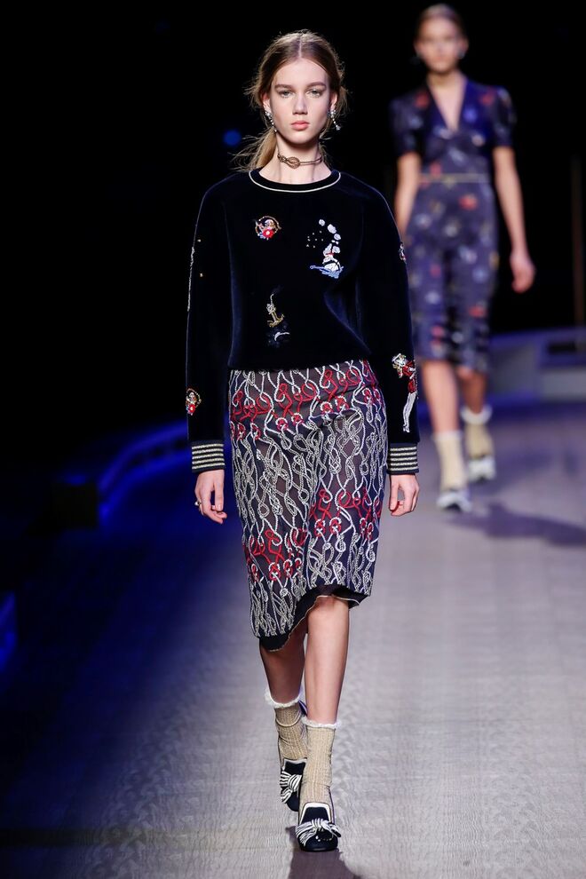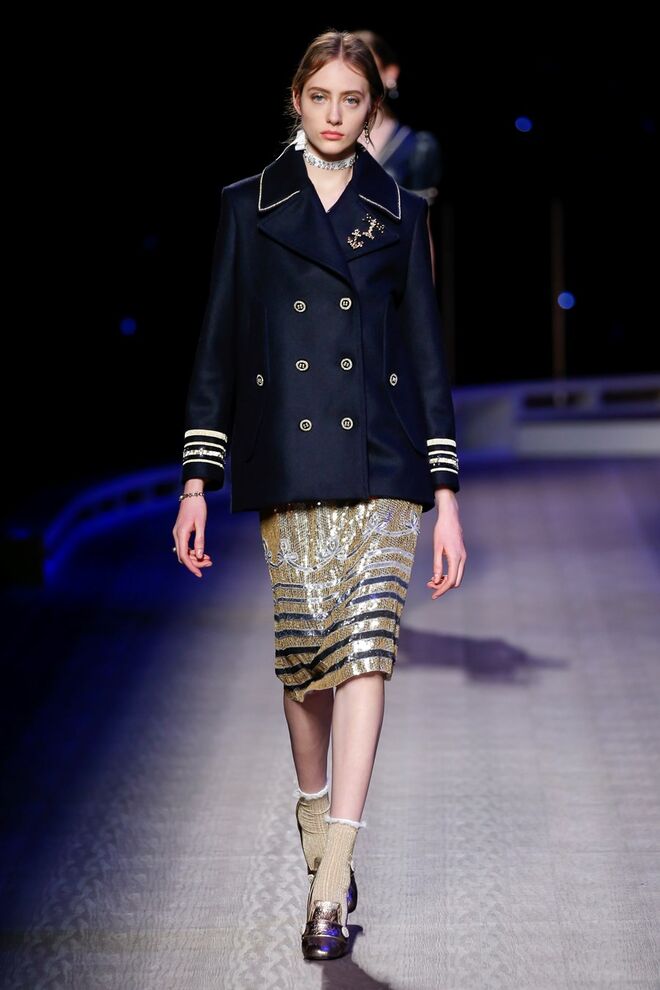 A coleção inspira-se na ideia das mulheres atuais, que encontram o vestido favorito da avó na década de 1940, regressando ao vintage; que vestem os casacos do namorado, e que vestem sem medo sapatos cintilantes antes de sair de casa. O espírito livre está no coração da coleção Outono 2016, derrubando todos os códigos do classicismo de uma forma peculiar. Casacos militares estão mergulhados na tradição com cortes ainda maiores em lã de inverno e adornados com medalhas douradas e metais preciosos. Suéteres em estilo pescador são suavizados com o toque de tule e calças marinheiro com pernas largas surgem em cortes de veludo, a vitrine perfeita para mocassins de salto com grandes laços de lantejoulas. A mistura continua com blusas clássicas cobertas com lantejoulas, pijamas atraentes e vestidos de seda leves com estampas inspiradas nas tatuagens de marinheiros.