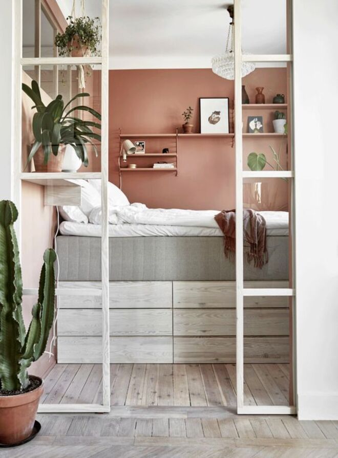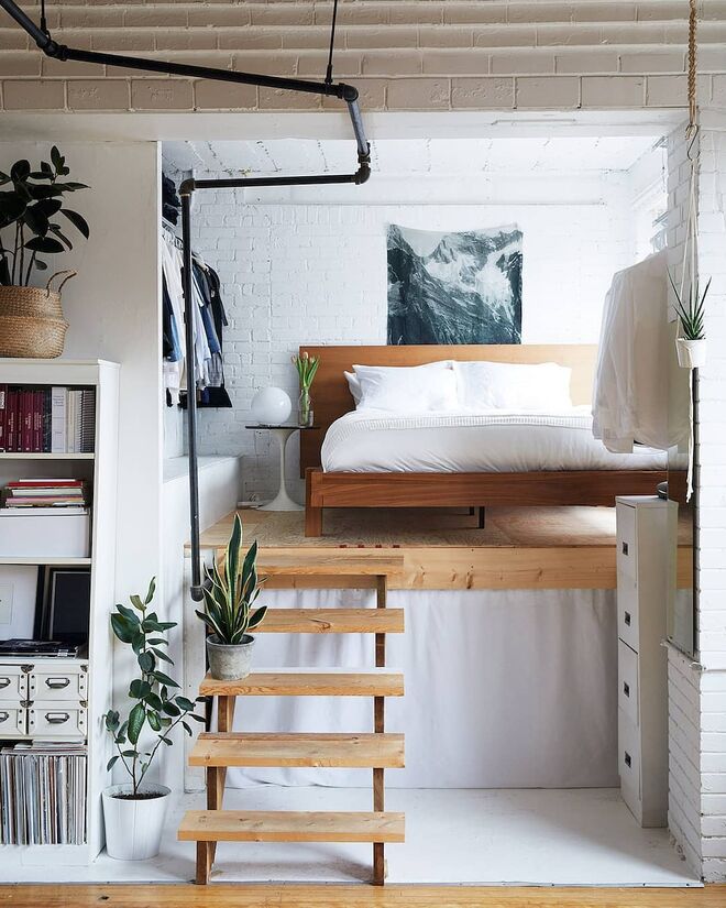 Se o seu espaço tiver altura suficiente, pode aproveitar e criar uma espécie de sótão, que pode ser utilizado como espaço de trabalho. Se não o for, não se preocupe. Utilize uma parede que esteja mais livre e acrescente-lhe prateleiras altas, em vez de largas, para armazenar livros, louças, discos ou filmes.