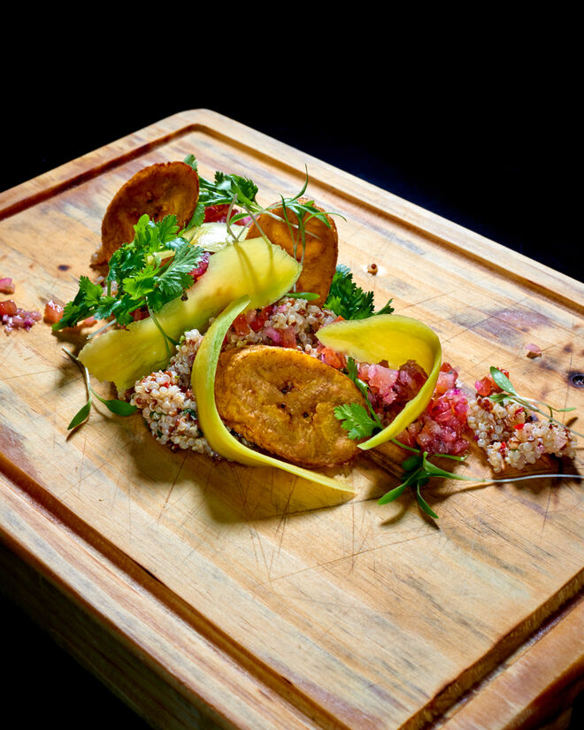 Para os apreciadores da cozinha vegan há opções confecionadas com ingredientes de origem biológica (como os dos restantes pratos) como a quinoa com ceviche de manga verde e banana (€12) ou a francesinha vegetariana (€16).
