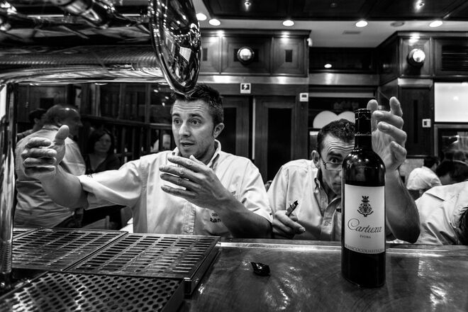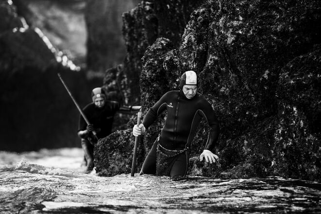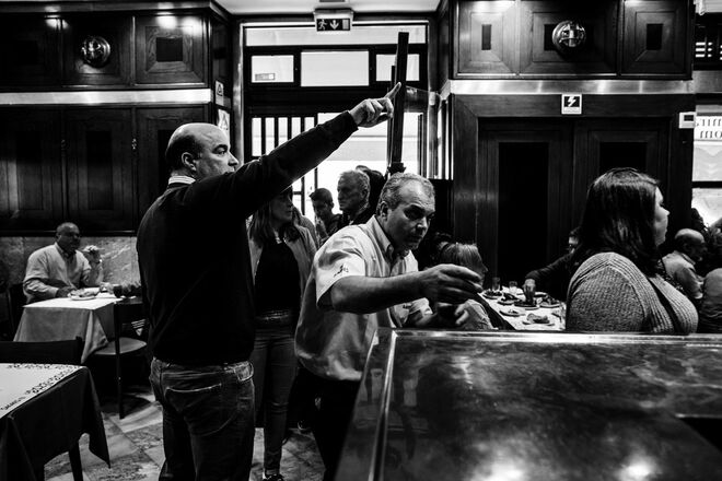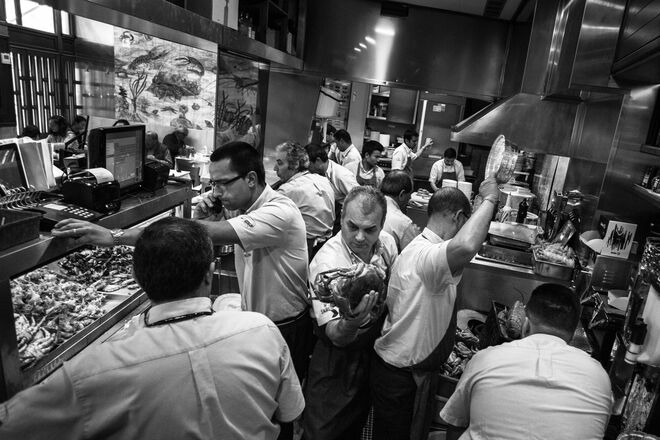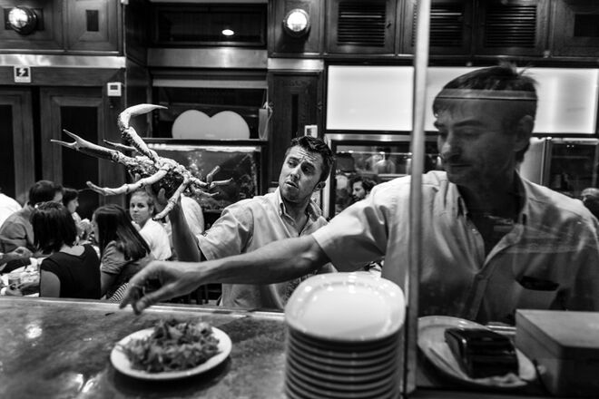 "Já tive em quase todas as cozinhas desse país, faltava-me uma cozinha dessas, de um registo mais popular, sem ser fine dining, e foi fantástico. Era um desafio que me faltava: uma cozinha popular, muito quente e com muito barulho", partilha Paulo. E não foi apenas no Ramiro que ficou. Ter viajado de barco para fotografar os percebes [do Arquipélago] das Berlengas, em Peniche, por exemplo, fez parte do trabalho. "A respirar adrenalina, para mim, é fantástico. Também fomos visitar a Ria Formosa, de onde vêem as ostras do Ramiro, fui a Espanha, a Jabugo, onde fica a fábrica do [presunto] Cinco Jotas, fui também de barco para a Ria de Aveiro, à fábrica das Sagres, ao fornecedor de sapateiras, santolas e lagosta na zona do Guincho – e esperei por um dia com céu carregado, com tempestade, porque para mim o Guincho é isso, é aquele mar intenso, revolto. Foi um trabalhão realmente incrível", recorda o fotógrafo.