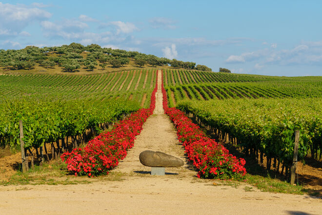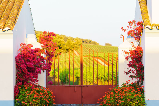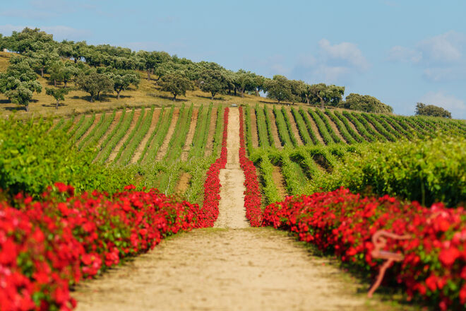 Somos recebidos com um amplo sorriso de boas vindas e um pedido: "dêem-me só um minuto, vou só calçar-me" que imediatamente quebra qualquer sensação de intrusão que pudesse existir à priori. Enquanto Julian desaparece pelas portas da bela fachada azul e branca de sua casa, rodeadas de flores, contemplamos o extraordinário cenário, onde o expoente máximo da beleza termina precisamente na linha do horizonte, onde os 41 hectares de vinhas verdes e viçosas surgem em torno de um pequeno monte. Empreendedor e criativo por natureza, Julian Reynolds comprou os 200 hectares que compõem esta herdade no alto Alentejo em 1996, a fim de resgatar uma tradição antiga. Com o fervor com que fala sobre os seus antepassados ninguém diria que tivesse feito outra coisa que não dedicar-se a este complexo negócio vinícola. Mas afinal, e mais à frente durante este passeio, conta-nos que estudou Belas-Artes e posteriormente tirou um curso de guionista no Royal College of Arts, em Londres, o que lhe valeu o seu primeiro emprego: assistente de direção na Colombia Pictures. Mas já lá vamos.