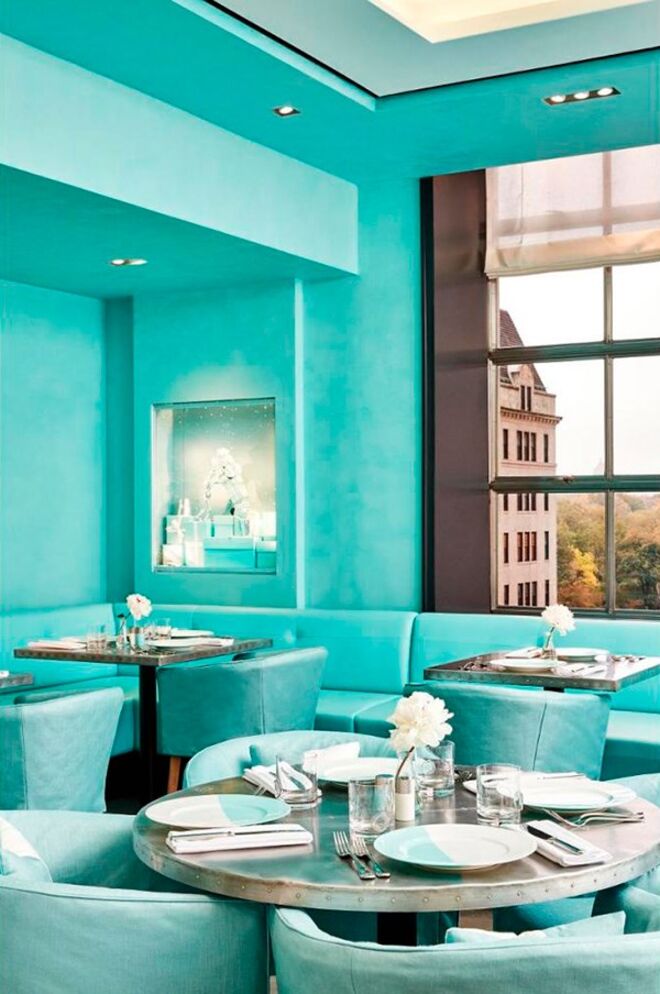 Trata-se do Blue Box café, instalado no recém-reformulado quarto andar da flagship store da marca, em Nova Iorque. Tem uma maravilhosa vista para o Central Park e está decorado com a emblemática cor turquesa, um dos símbolos da marca de joias, das paredes às cadeiras, passando pelos pratos.