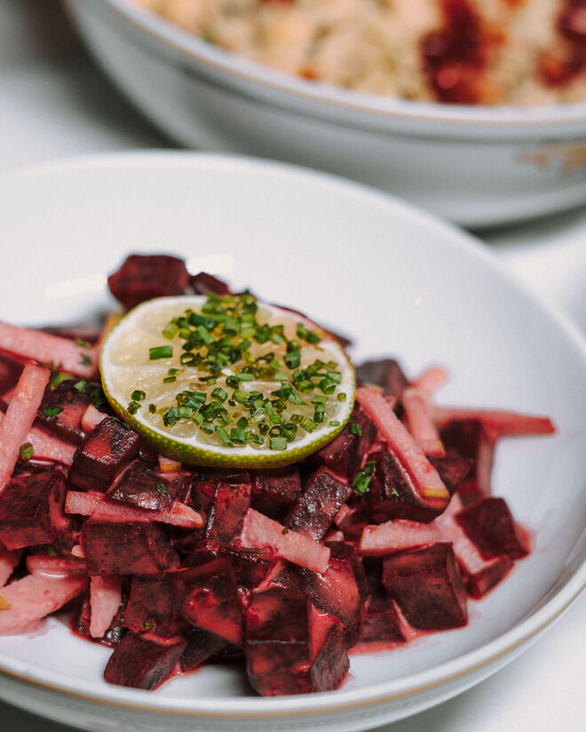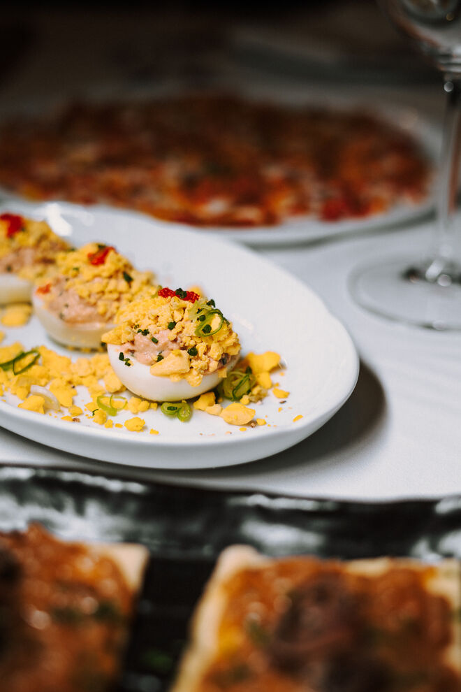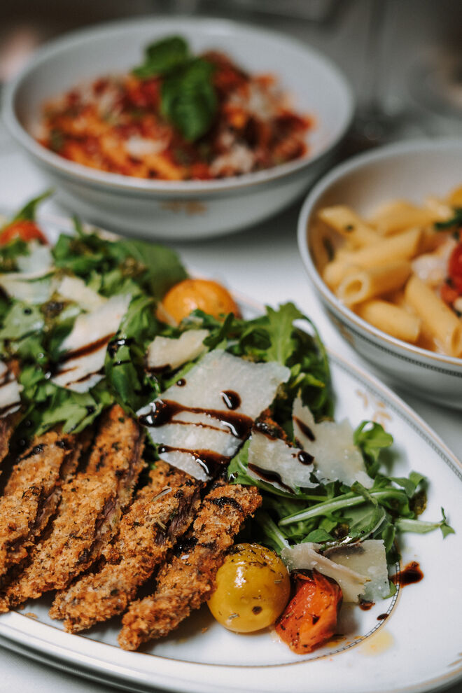 Depois destas boas vindas, à mesa chegam os pratos de peixe: uns ovos mimosa recheados e um carpaccio de polvo. Seguem-se as saladas, uma opção para vegetarianos que promete agradar a todos: há uma taboulé, que é uma salada libanesa servida com tomate, hortelã, cebola, bulgur e salsa picada, temperada com azeite, sumo de limão, sal e pimenta e uma salada quente ratatouille com feta. Para refrescar, chegam também a salada de beterraba, maçã e aipo e a salada verde com requeijão.Uma trasição leve, equilibrada e que desperta os paladares para o que segue: as massas e a carne.