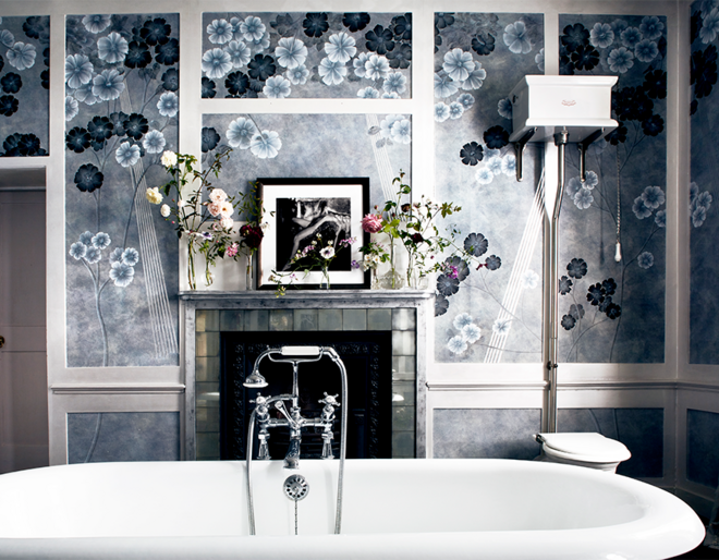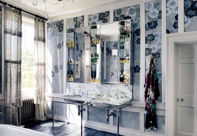 "A casa de banho é das zonas que mais se visita numa casa, por isso é bom saber que tenho um espaço assim tão cheio de luz e repleto de delicadas flores pintadas à mão. Adoro os filmes antigos em que apareciam aquelas casas de banho repletas de divãs. Na casa de banho da minha casa de campo tenho um sofá Chesterfield e, quando celebro o meu aniversário, acabamos todos ali. Tem um gira-discos, é acolhedora e todos são ali bem-vindos", revelou Kate Moss acerca deste projeto.