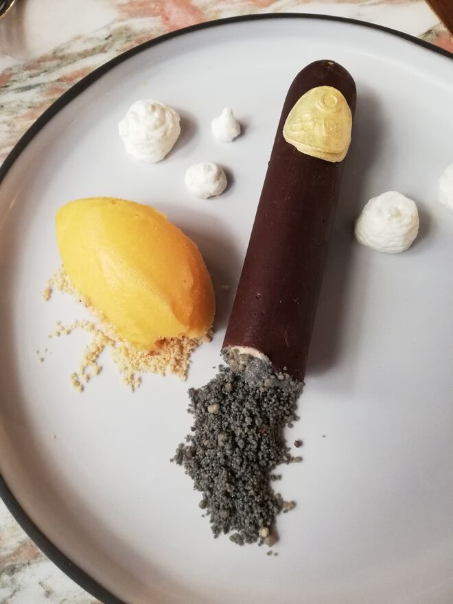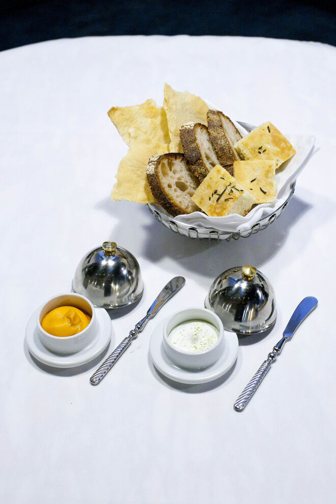 Para acompanhar a sua taça de champagne, peça o couvert (€4,50 por pessoa), com pães de fermentação lenta, focaccia, alecrim e tougarashi e flatbread com as deliciosas manteigas de cabra e pó de louro e gordura de porco preto com escamas de sal. O chef Tomás Pires explica-nos que a carta está dividida por animais, primeiro os bovinos, depois suínos, as aves e os peixes. Destacamos da nossa experiência o carpaccio maturado 180 dias (€19) com azeite e queijo da ilha São Jorge com 36 meses de cura, o bife de lombo 250 g (€27) acompanho do delicioso arroz de morcela e verde tinto (€6) e do suculento xerém de tomate assado (€6).
