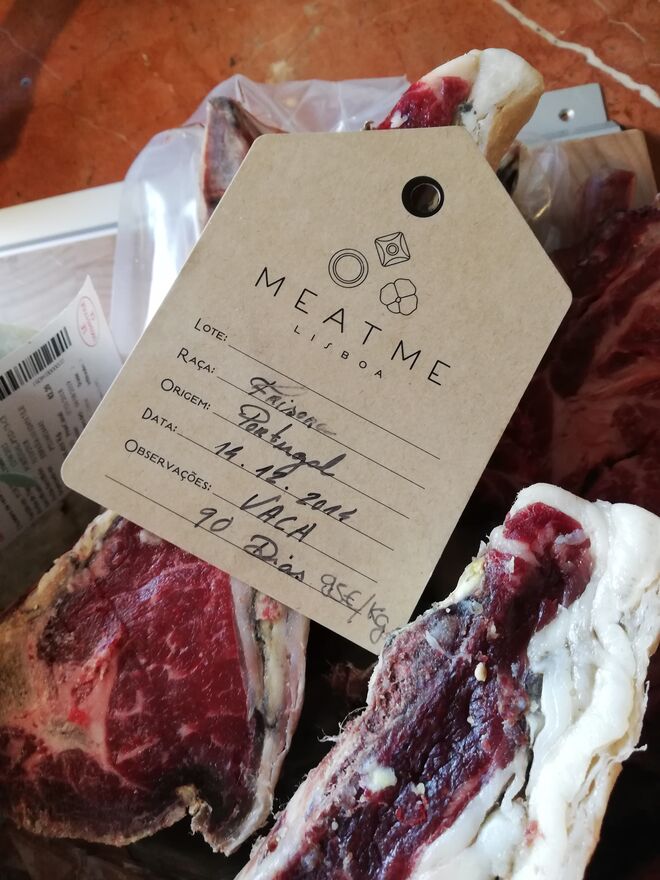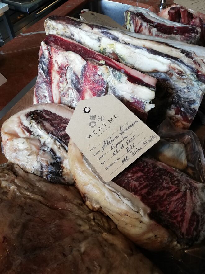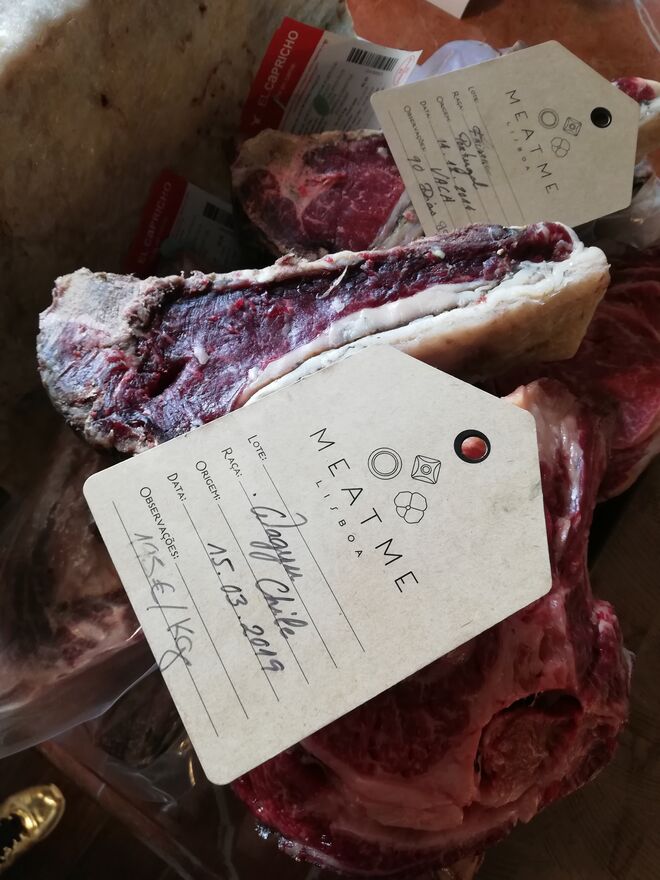 A carne pode ser escolhida no talho que está à vista, entre peças gigantes de bovino maturadas e também presuntos de vaca e de porco. O mais curioso é que todas têm uma etiqueta com a origem, a raça, o tempo de maturação, o sítio onde o animal vivia e onde morreu e o seu nome. Isso mesmo, o nome. Não se poder esperar menos de um restaurante que tem um "sommelier" de carnes. Bruno Fortuna explica tudo o que se sabe sobre as peças e foi quem nos contou que estas vêm da Bodega El Capricho, em Léon, Espanha. Um lugar onde se criam os animais e que tem também um restaurante, considerado (até agora) o melhor assador da Península Ibérica.