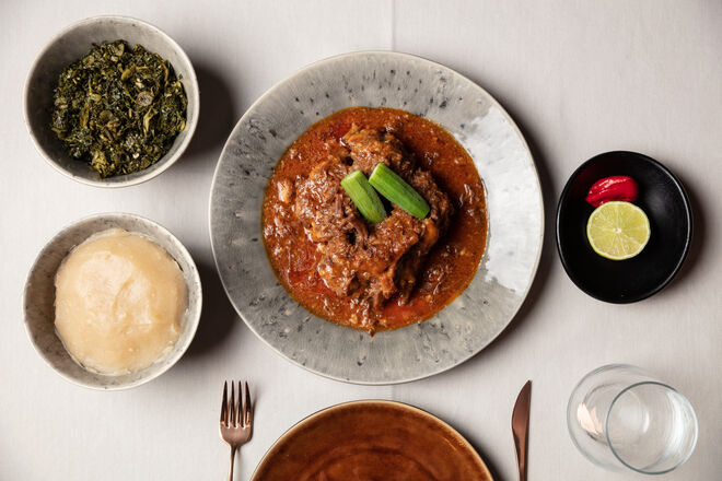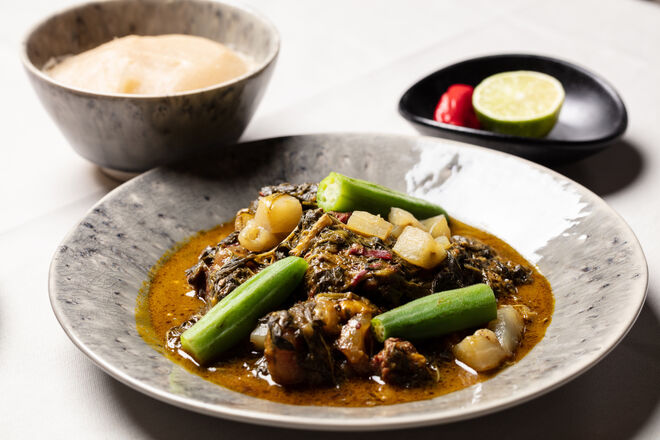 Comece por pedir um sumo natural de múcua – o fruto do Imbondeiro cujo sabor é uma mistura de goiaba e pêssego. Na carta, destaque para o Calulu de Peixe Seco e Fresco (€36) uma corvina servida com funge e quiabo e a deliciosa e consistente Moamba de Gimguba (€30,90), que também tem opção vegan, a Moamba de tofu.