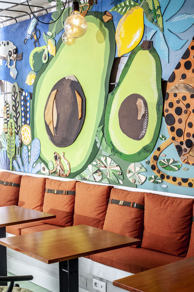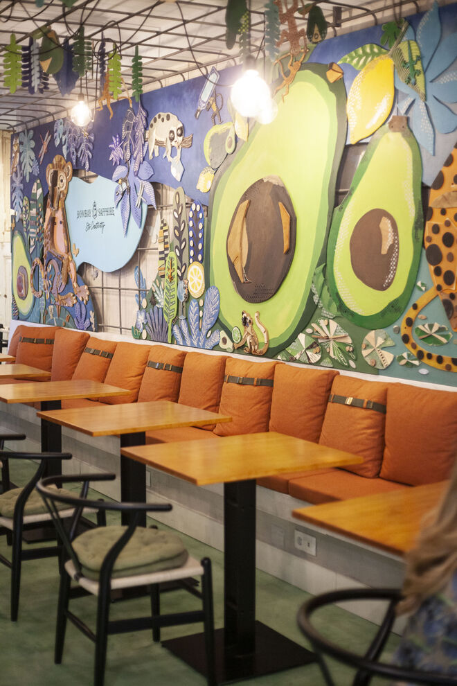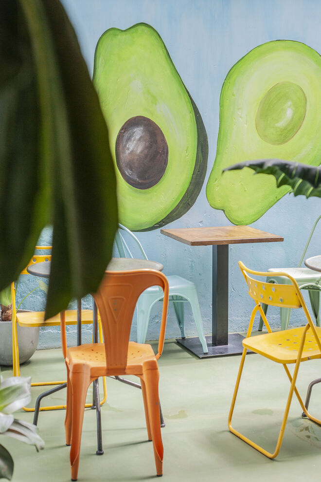 "Estive um ano a estudar e a testar receitas na minha casa, inicialmente tinha mais de 70 pratos na carta." Mafalda não só pensou nas receitas originais, como na decoração e até no design das fardas de todos os funcionários. Antes de abrir, estudou os restaurantes de abacate no mundo, como o Avobar em Londres, o Avicado Appetit, em Nova Iorque, o The Avocado Show em Amesterdão e o Avocado Bar Roma, em Roma. "Quis ter vários upgrades em relação a eles, quis que a comida fosse saborosa e não só "instagramável", ter uma decoração fresca e leve, à volta do verde, ter um horário alargado que fecha à meia-noite, e ter uma carta específica só para a noite. Há pessoas que vêm só depois de jantar beber um copo". Na esplanada interior, um mural de abacates gigantes, pintado pela artista Denise Prino, chama à atenção pela explosão de cor e originalidade. Há, também abacateiros em todos os cantos e no fim da refeição, com a conta, é entregue um caroço de abacate para o que o cliente possa plantar (caso queira). Além disso, o espaço também é sustentável, evitando-se o plástico e o desperdício. O espaço também tem merchandising, com artigos alusivos ao fruto.