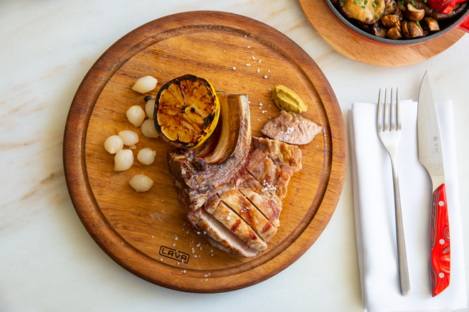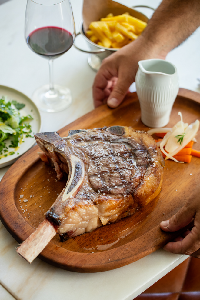 Na carta de pratos principais, todas as atenções se viram para a carne e as suas particularidades. Surgem sugestões diferentes como bife do beijinho Black Angus nacional (€14) ou mão de cabrito e batata assada (€28) ou outras menos "arriscadas" como bife da vazia nacional à cortador (€19,50) ou costeleta de porco do Montado (€14,50). Se quiser uma experiência ainda mais especial, será uma boa opção provar uma das carnes maturadas. É o caso da costeleta de boi minhoto castrado (com 45 dias de maturação, €215 o kg) ou da costeleta arouquesa (com 60 dias de maturação, €110 o kg). Para acompanhar há saladas – verde, de tomate, de pimentos ou de legumes grelhados - as incontornáveis batatas fritas, além das diversas variantes de molhos (como o de mostarda com azeitonas verdes e damascos ou o molho agridoce com marmelo). Num local que à partida seria avesso a vegetarianos, o chef Vitor Sobral surpreende com uma paella da terra (€12,50) e uma lasanha de legumes (€14,50) como opções verdes. Chegando às sobremesas, o derradeiro final, o cardápio não desilude. Vale muito a pena pedir o pudim de mel e laranja (€6), o creme queimado de maracujá (€5,50) ou o bolo de queijo e frutos vermelhos (€6,50).