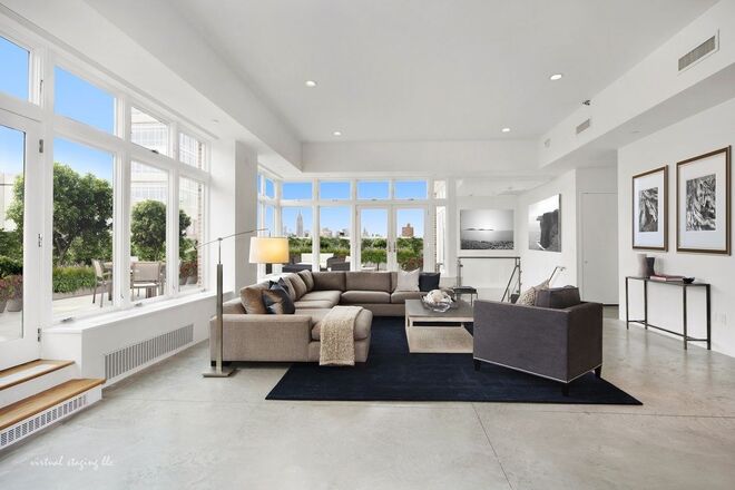 Trata-se de um duplex com quatro quartos e um enorme terraço com uma maravilhosa vista sobre os arranha-céus de Manhattan, incluindo o Empire State Building. A sala principal está encostada à cozinha, tem uma lareira e acesso direto ao terraço.