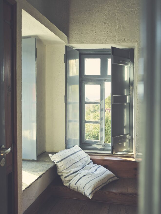 Roupa de cama, cobertores, almofadas, toalhas e roupões de banho. Tudo inspirado no mar azul do sul da Europa.